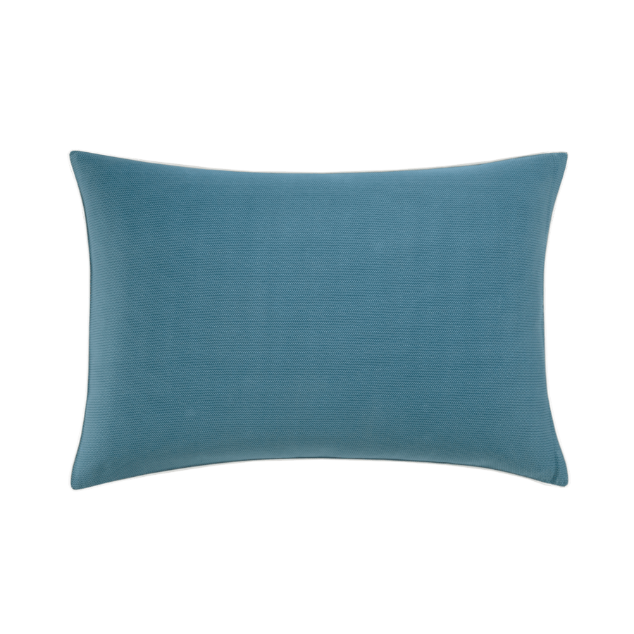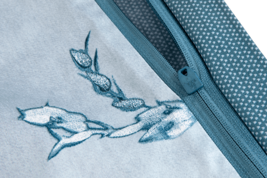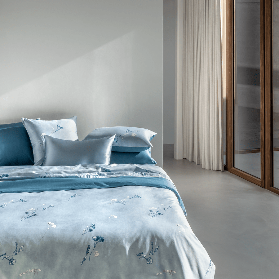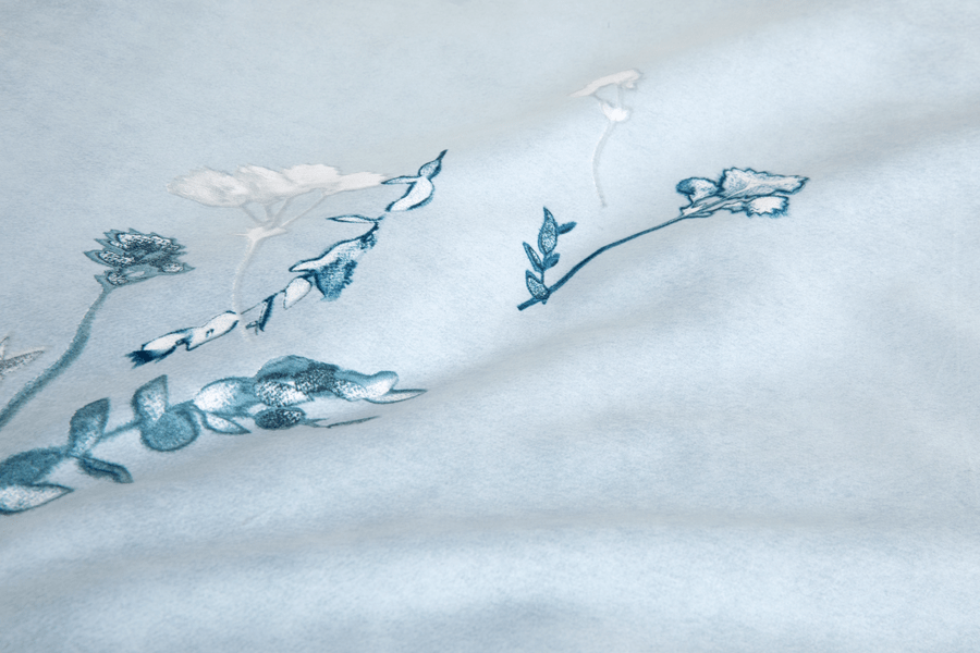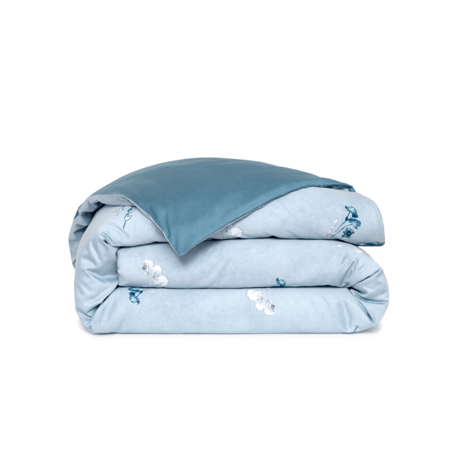 Contra um fundo de céu azul acinzentado, tons de névoa, gramíneas e flores silvestres aparecem nas estampas. O cetim de algodão 300 fios é aliado a uma inspiração natural e suave. No verso, um padrão estampado evoca uma sementeira de finos grãos, em tom tempestuoso. As fronhas são finamente debruadas em branco.