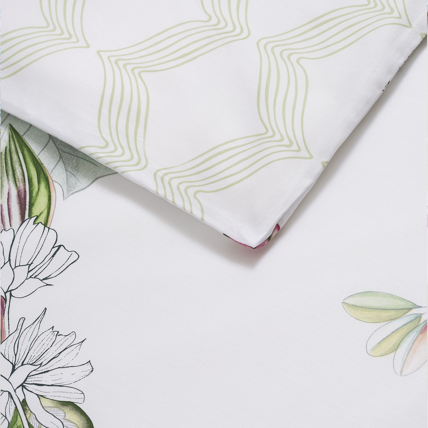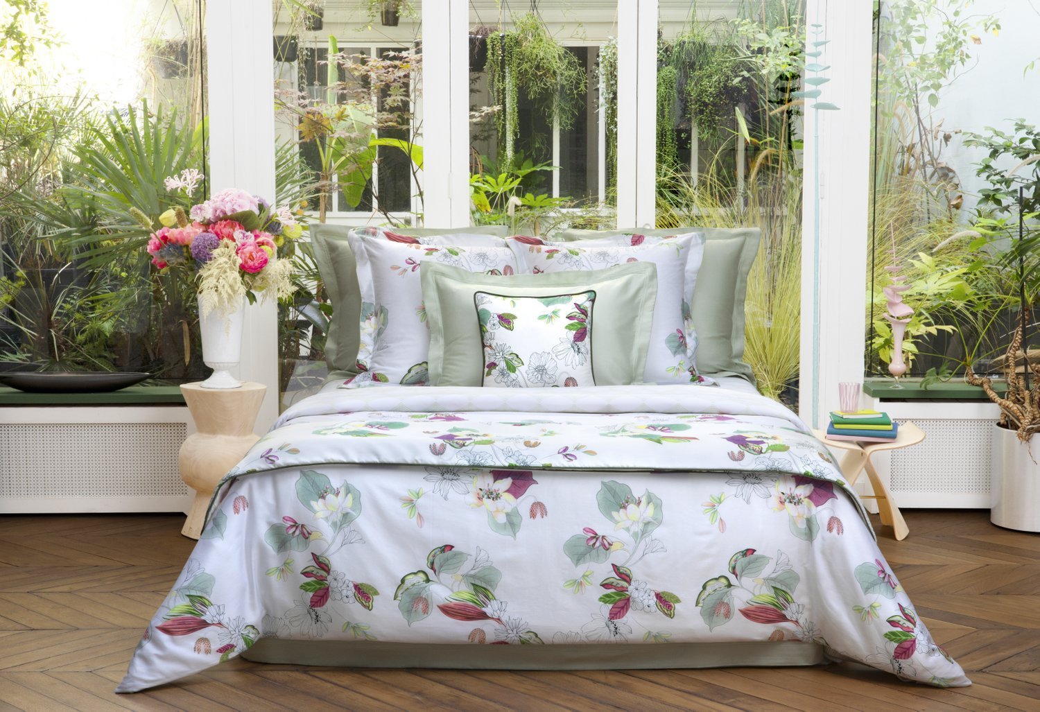 Jardins exuberantes com aromas de verão são um convite à viagem. Flores pintadas, desenhos de linhas e detalhes preciosos da imaginação: a estampa Riviera expressa a riqueza sofisticada dos florais decorativos. Esta linha é fabricada em algodão acetinado 300 fios 100% fibra longa. Sua estampa traz cores vivas em meio ao fundo claro, deixando o ambiente ainda mais elegante e sofisticado. Riviera apresenta acabamento canalizado e design dupla-face, o que possibilita a coordenação com itens na cor verde sage da Yves Delorme. O modelo possui roupão que combina com o enxoval, deixando a sua noite de descanso ainda mais completa. As peças estão disponíveis no tamanho Queen e Super King.