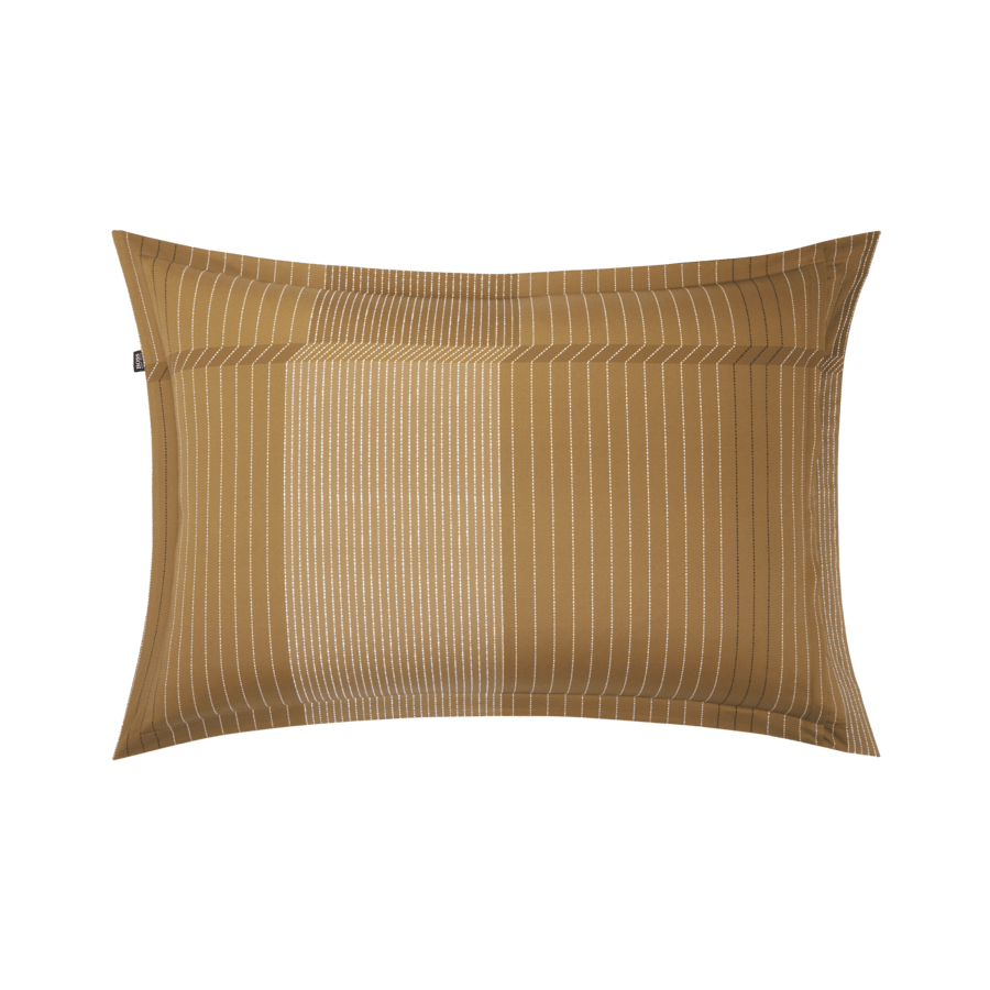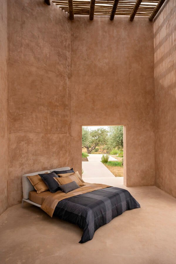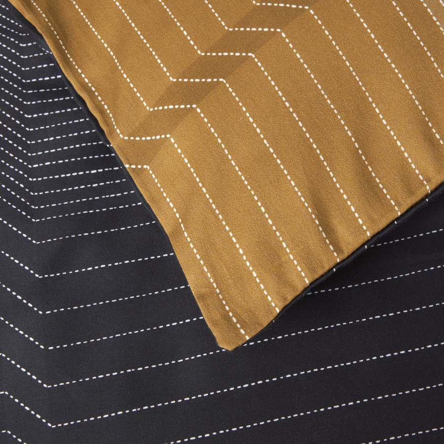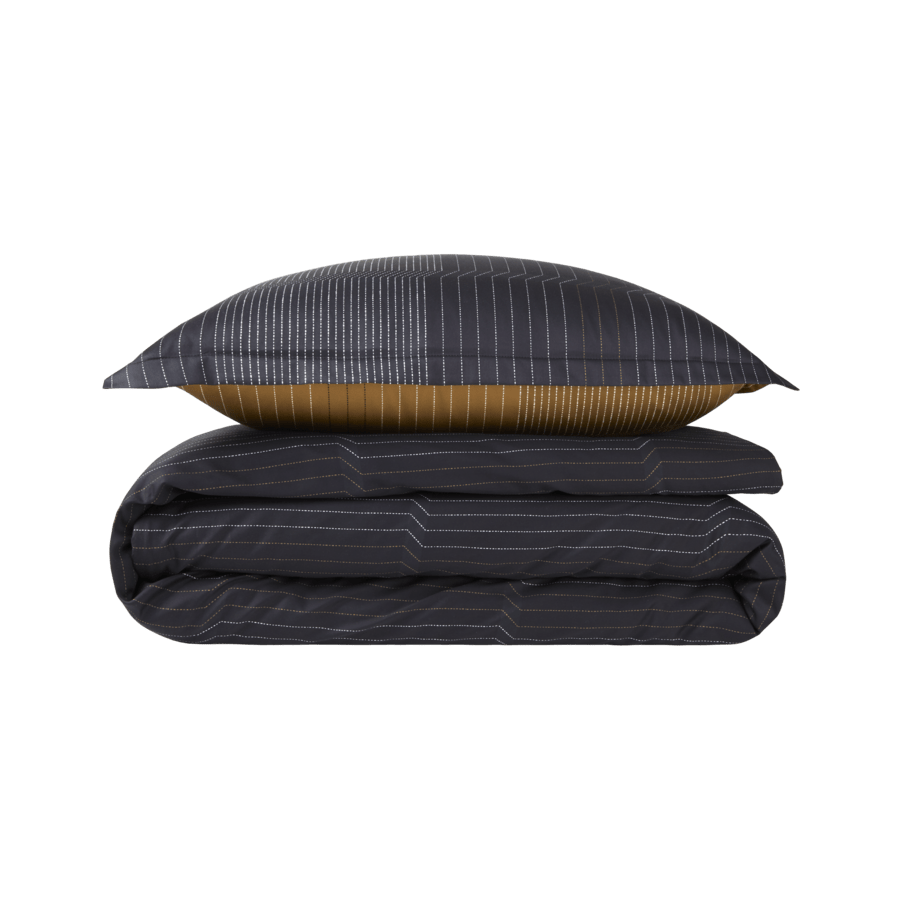 Tomando emprestados os códigos icônicos da marca, esta capa de duvet é estampada em cetim de algodão. As faixas rítmicas seguem umas às outras, um salto no alinhamento engana os olhos, criando um efeito ótico surpresa.
