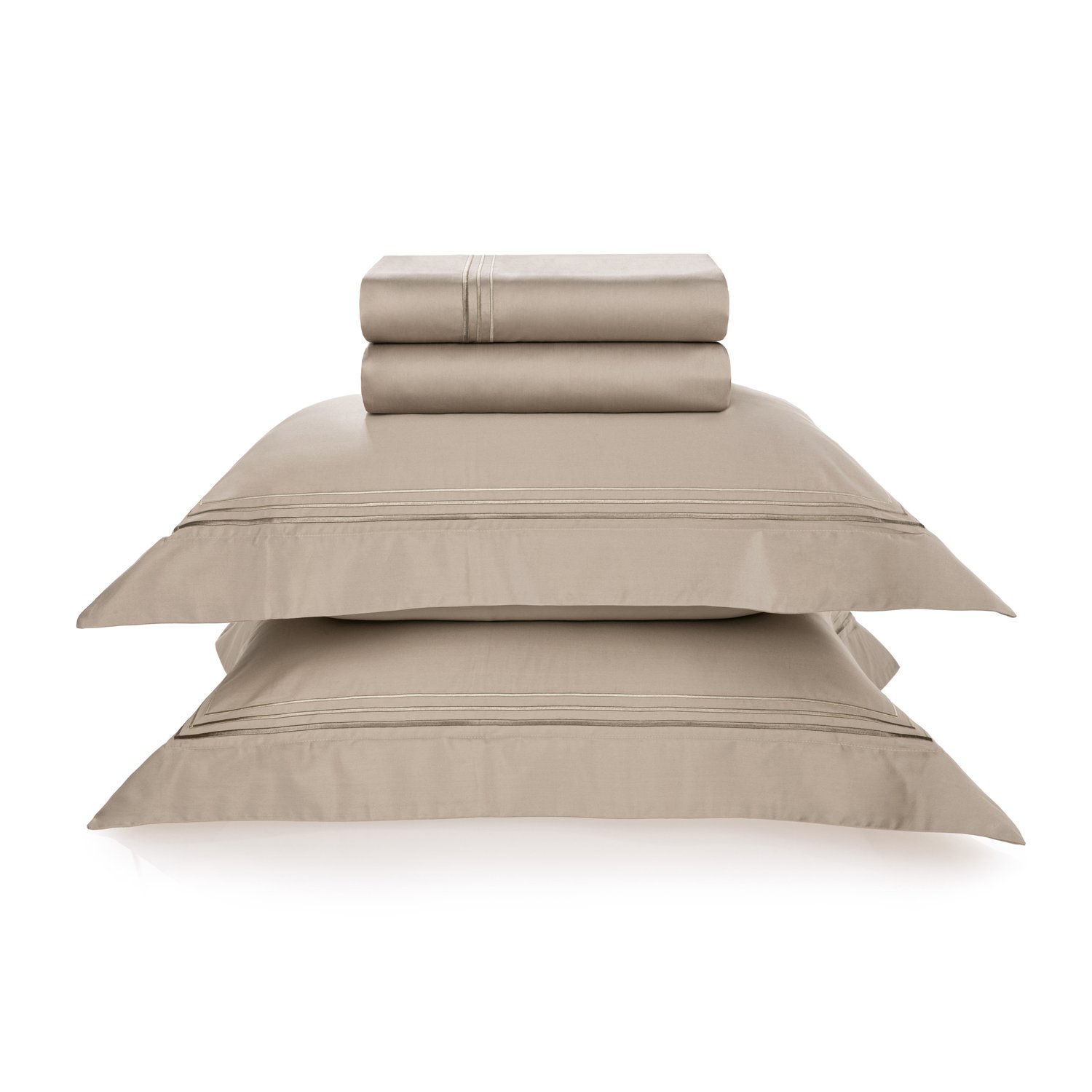 Possui acabamento sanforizado e mercerizado, processo que fortalece os fios, mantendo sua qualidade por mais tempo. O lençol de baixo possui elástico, se destacando pela facilidade no momento da troca e otimização de tempo. Já a sua fronha dispõe de dobra feita e ponto royal triplo.