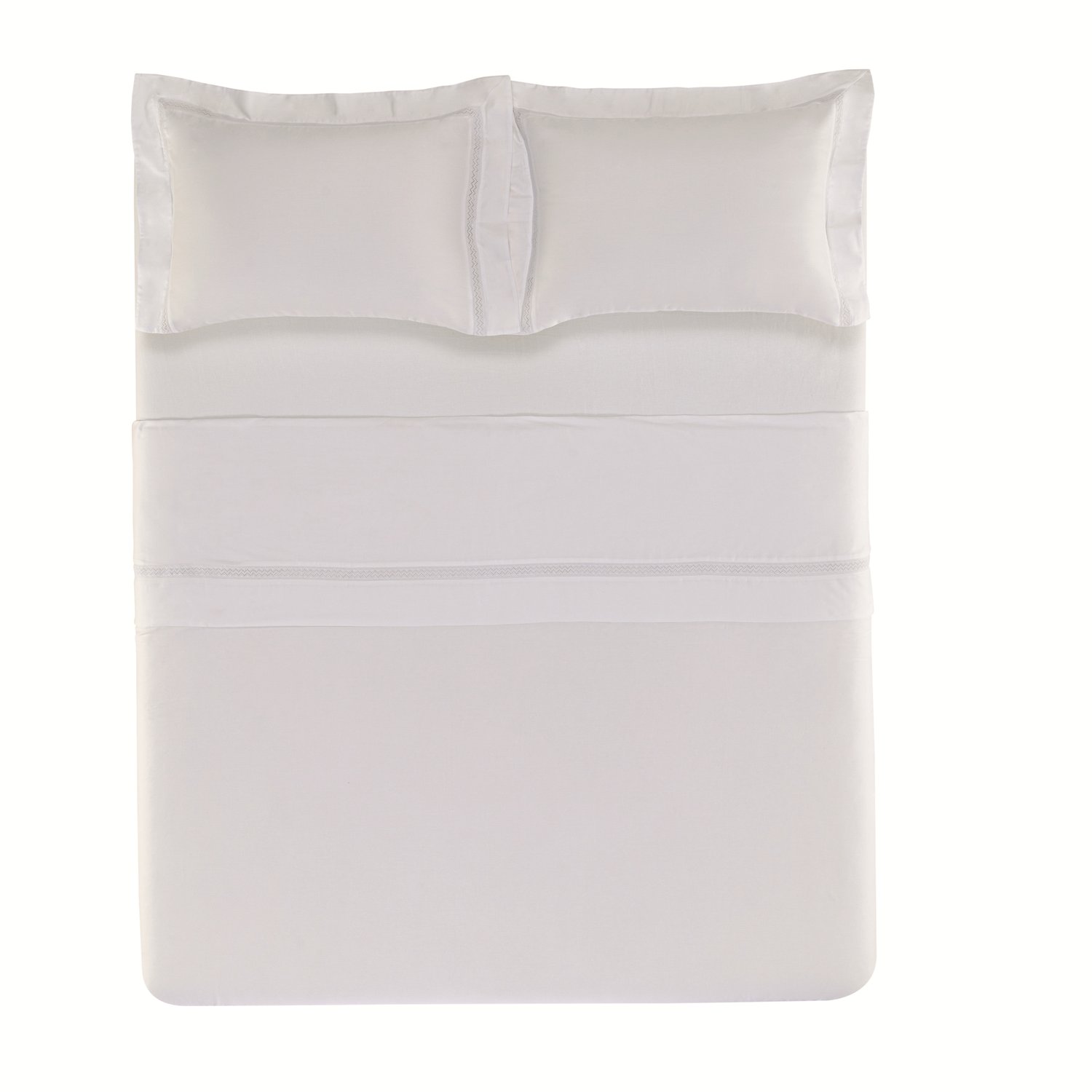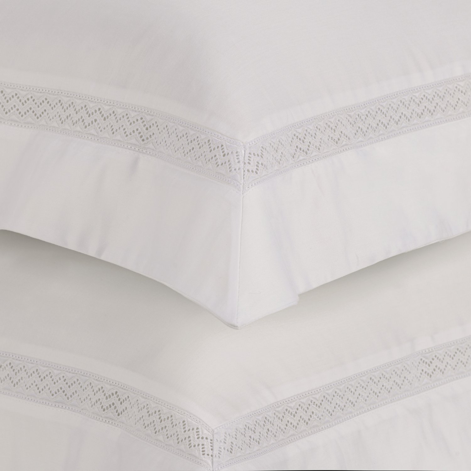 Características Adicionais: Fronha com 3 abas, entremeio bordada / Dobra feita com entremeio bordado / Lençol com elástico