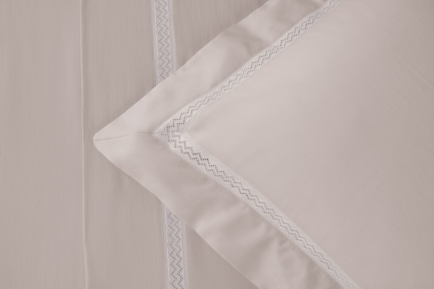 Características Adicionais: Fronha com 3 abas, entremeio bordada / Dobra feita com entremeio bordado / Lençol com elástico