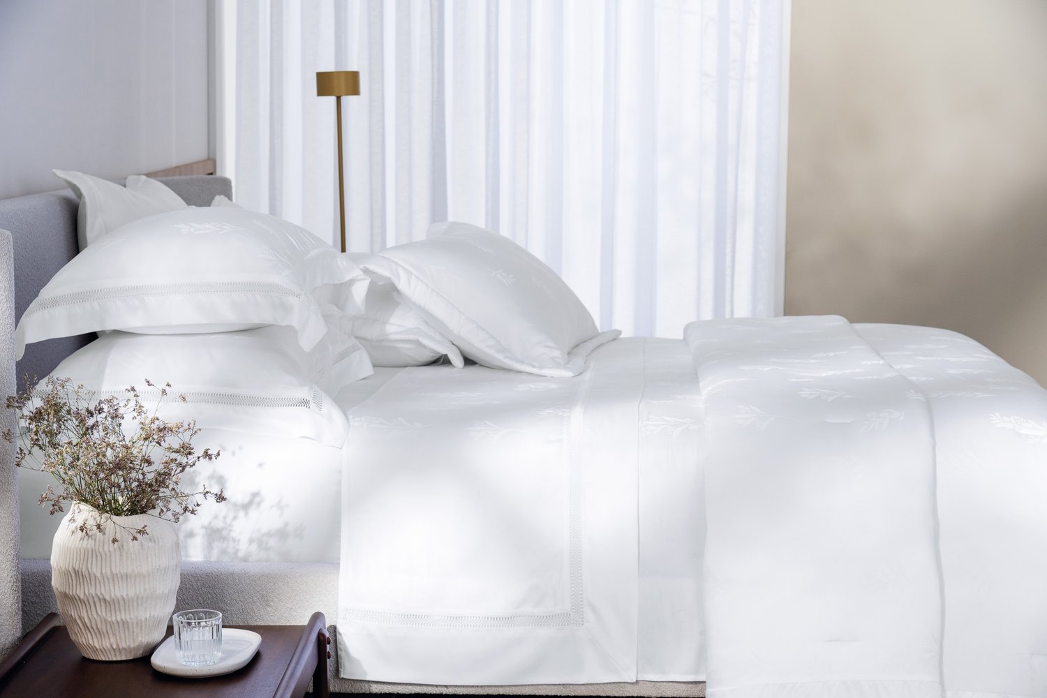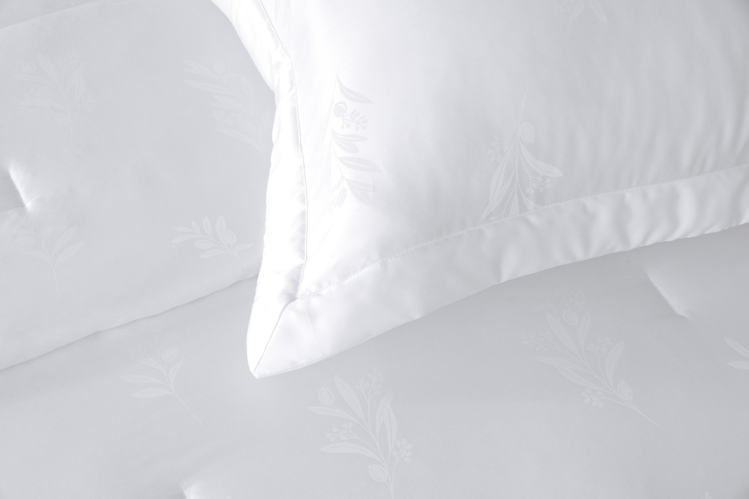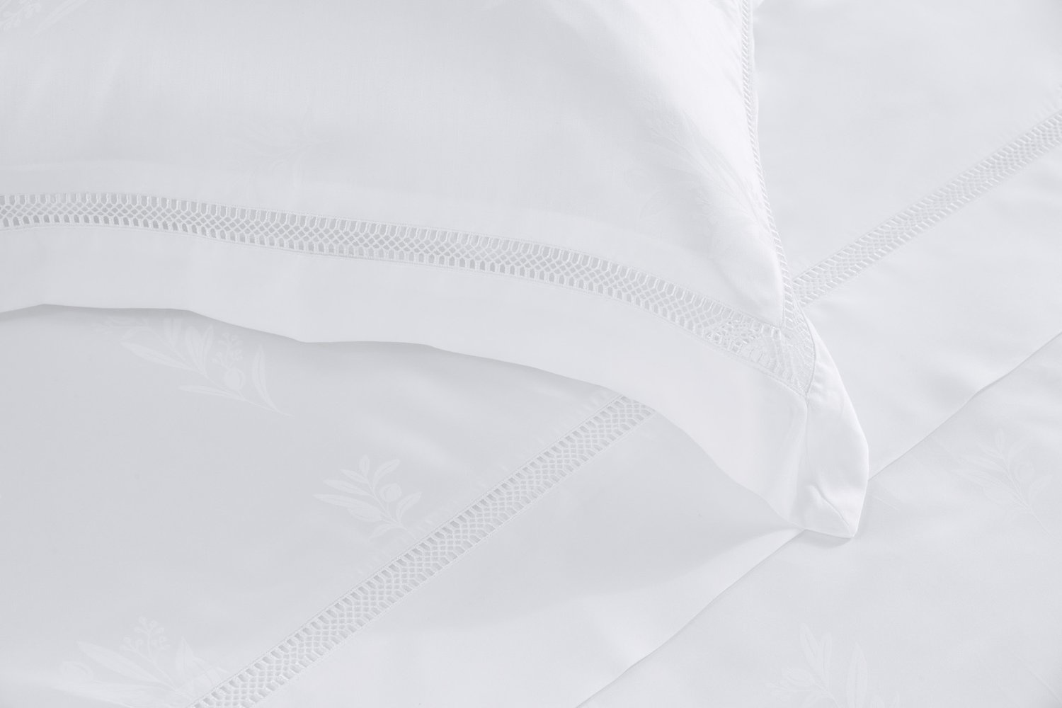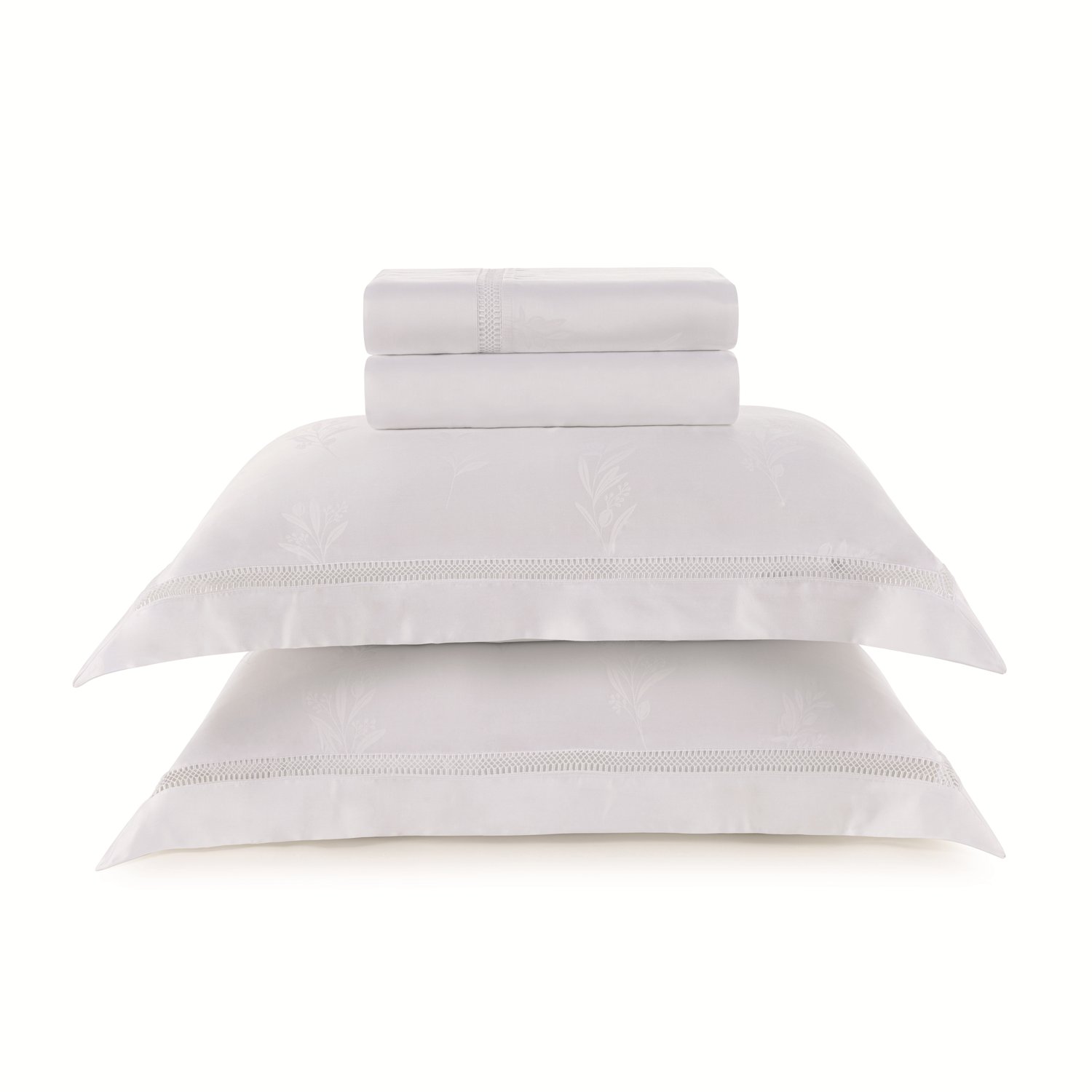 Características Adicionais: Fronha com 4 abas / Fronhas e dobra feita com entremeio / Jacquard / Lençol com elástico