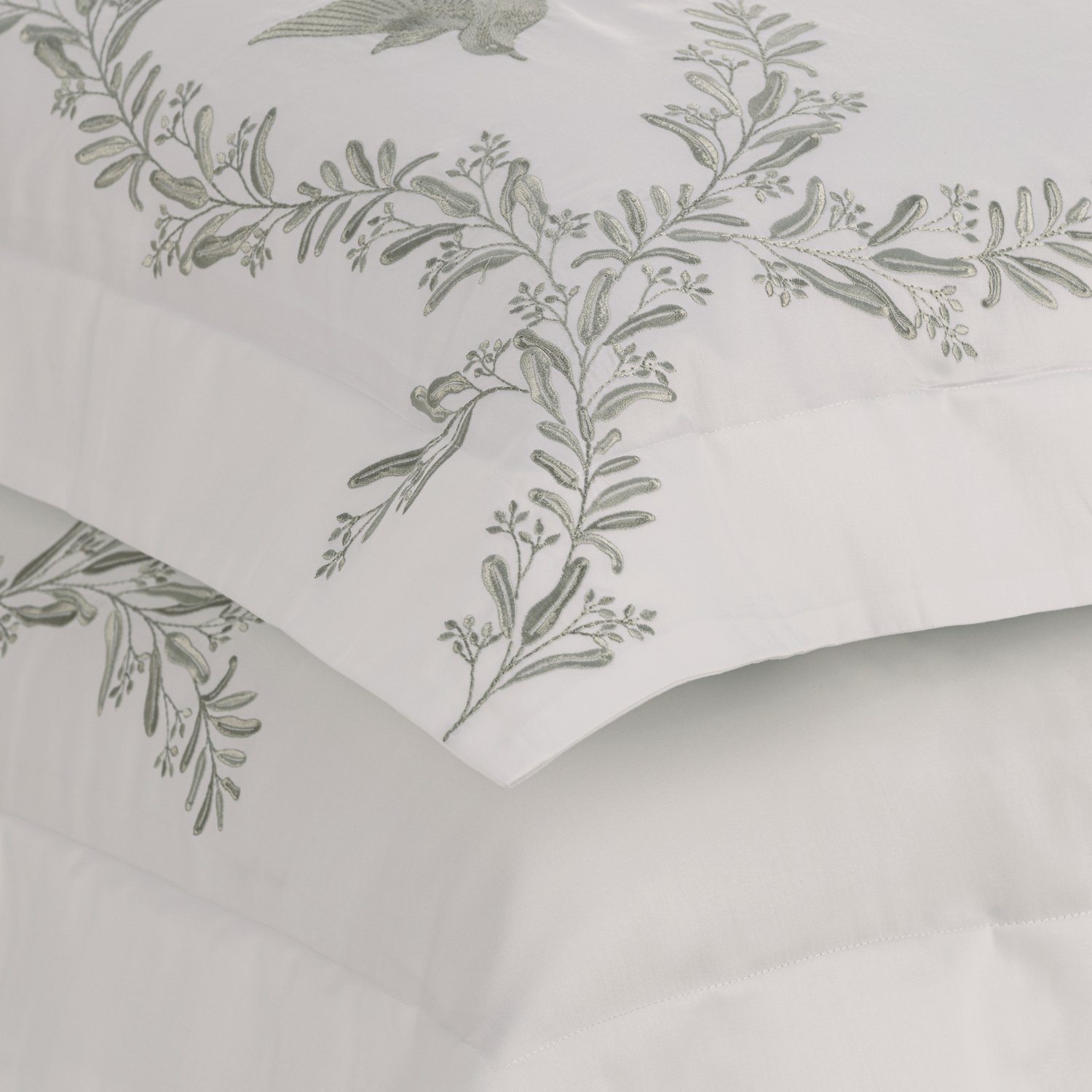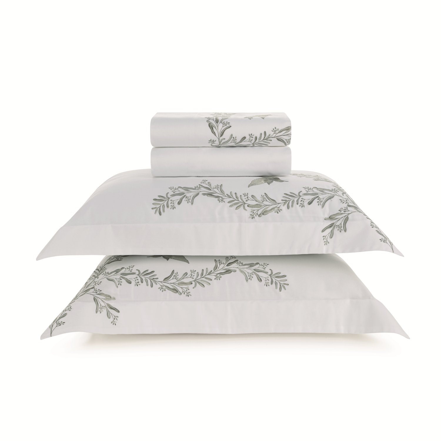 O bordado deste jogo de cama é inspirado no cultivo do pistache da cidade de Bronte. Localizada nas encostas do Monte Etna, a região possui um solo vulcânico rico, que proporciona condições ideais para o crescimento desse pistache de qualidade ímpar. Sua cor singular, sabor inigualável e aroma marcante o tornam um produto altamente desejado. Ao trazer essa inspiração para o bordado, a cama não apenas se torna um elemento decorativo, mas também uma forma de transmitir frescor e romantismo. A combinação de elegância e personalidade que este bordado oferece transforma qualquer ambiente em um refúgio acolhedor, onde a rotina ganha um toque especial e sofisticado.