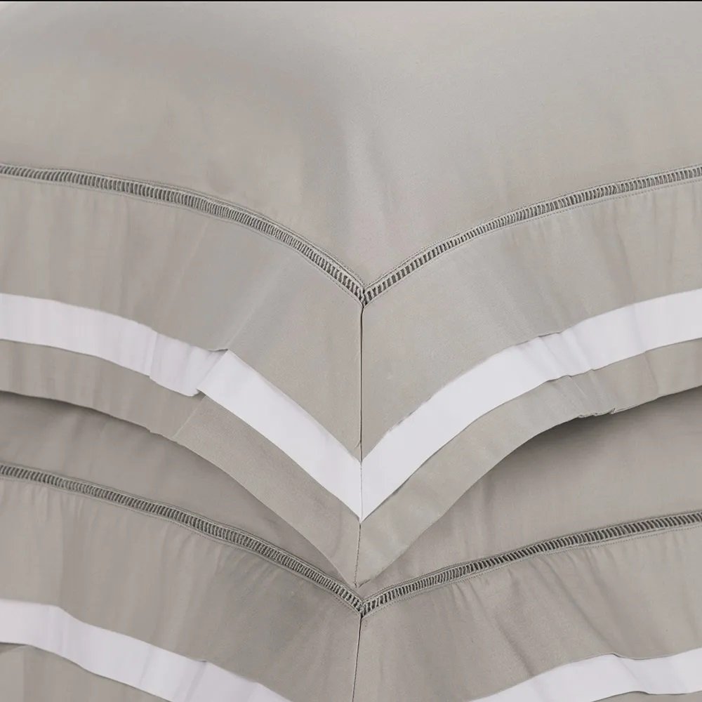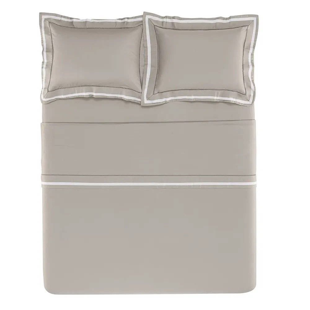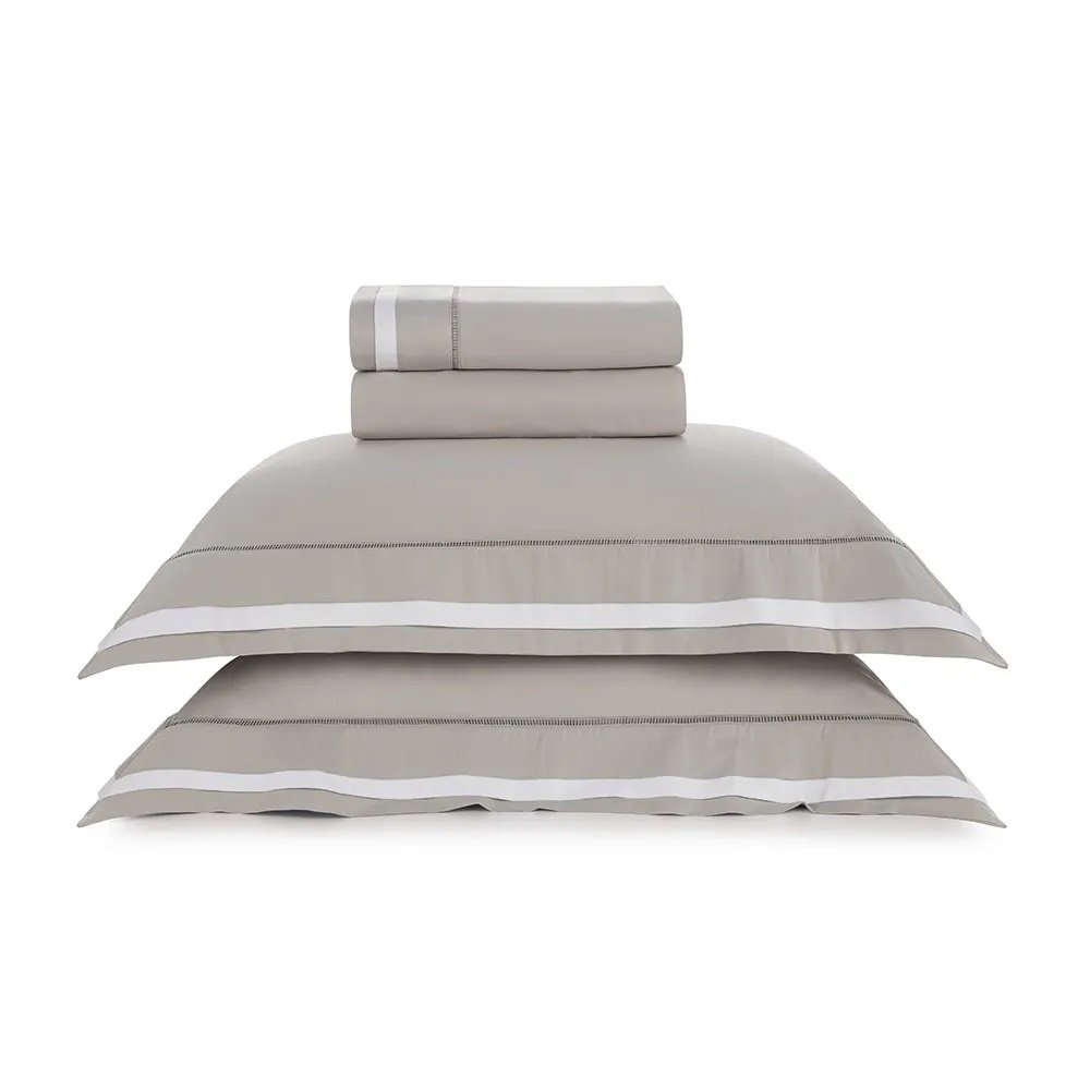 Em um tom clássico que une marmo com branco, o jogo de cama Valverde Queen traduz a elegância em sua forma mais pura. As referências à alfaiataria aparecem nos acabamentos precisos: as fronhas com 4 abas e entremeio bordado e a dobra do sobre lençol com aplicação de tecido demonstram atenção a cada detalhe. Com medidas de 2,40 m x 2,80 m, o sobre lençol cobre a cama com generosidade e leveza, enquanto o lençol com elástico, medindo 1,60 m x 2,00 m x 45 cm, garante encaixe perfeito ao colchão. O cetim 300 fios, feito em 100% algodão egípcio, proporciona um toque acetinado e duradouro. Um conjunto pensado para quem valoriza conforto, beleza e tradição em cada composição.