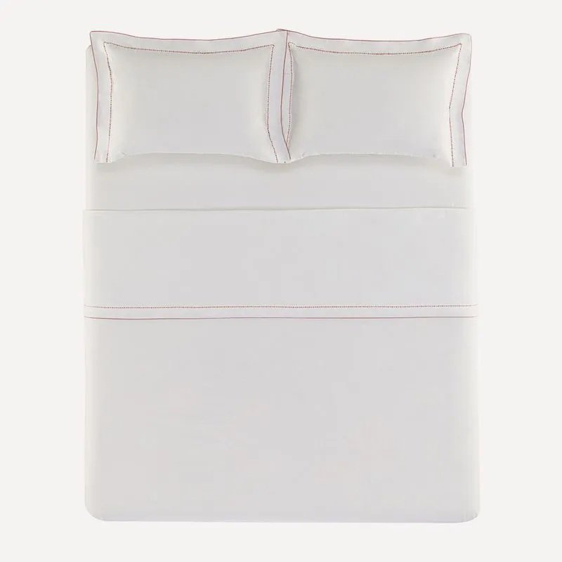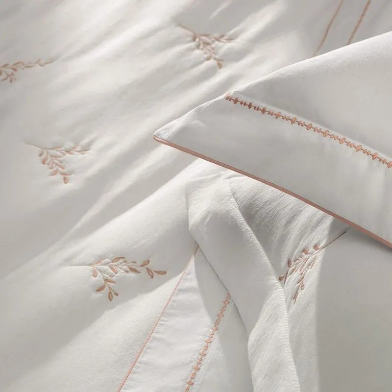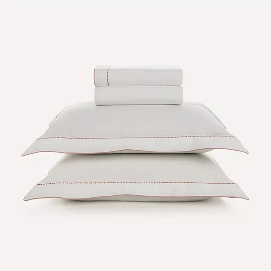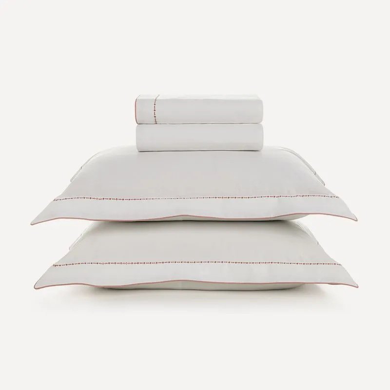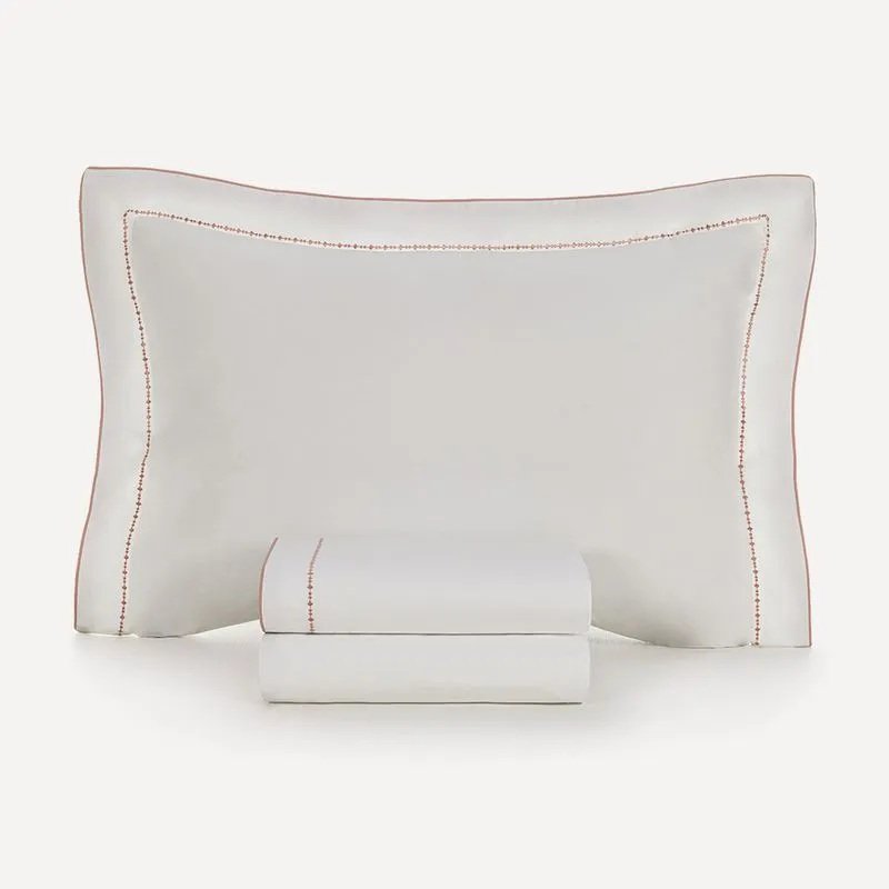 Delicado e minimalista, o jogo de cama Lina traz pequenos elementos geométricos bordados, que emolduram as fronhas e sobre lençol em uma composição sutil. Além disso, a fronha conta com três abas, filetadas com cordonê da mesma cor do bordado. A cama Lina é discreta e, ainda assim, tem detalhes e acabamentos que trazem muito charme para o quarto. Combina muito bem com almofadas, peseiras e edredons estampados em tons de rosa similares.