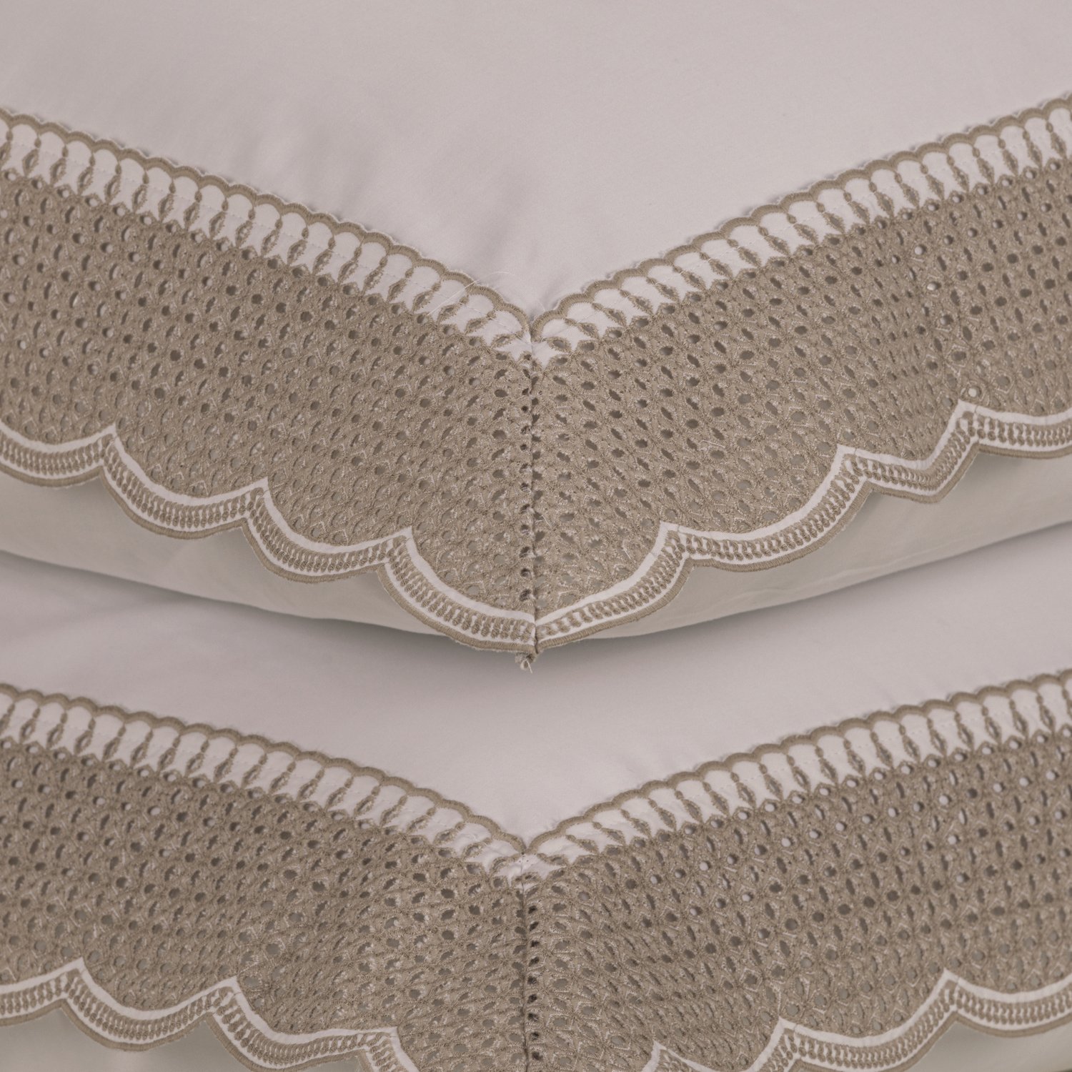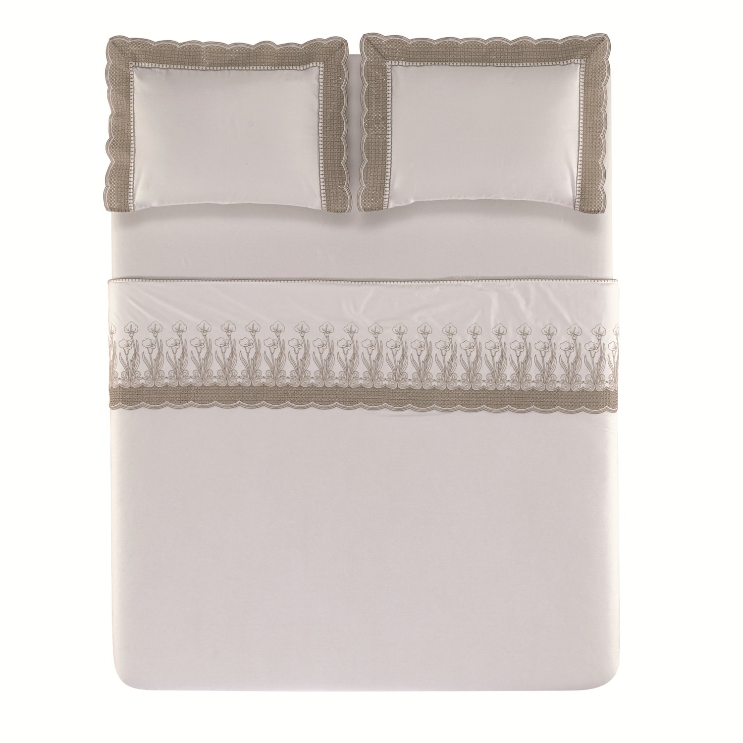 Características Adicionais: Fronha com 3 abas, tira bordada aplicada e canto inglês / Dobra feita com barrado bordado / Colcha com matelassado / Almofada com 4 abas e tira aplicada / Lençol com elástico