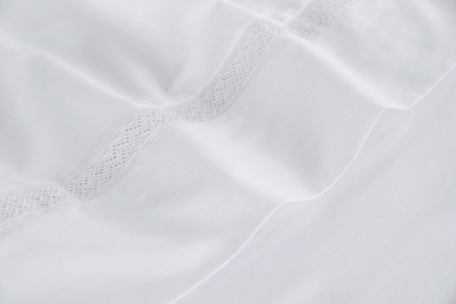 Características Adicionais: Fronha com 3 abas, entremeio bordada / Dobra feita com entremeio bordado / Lençol com elástico