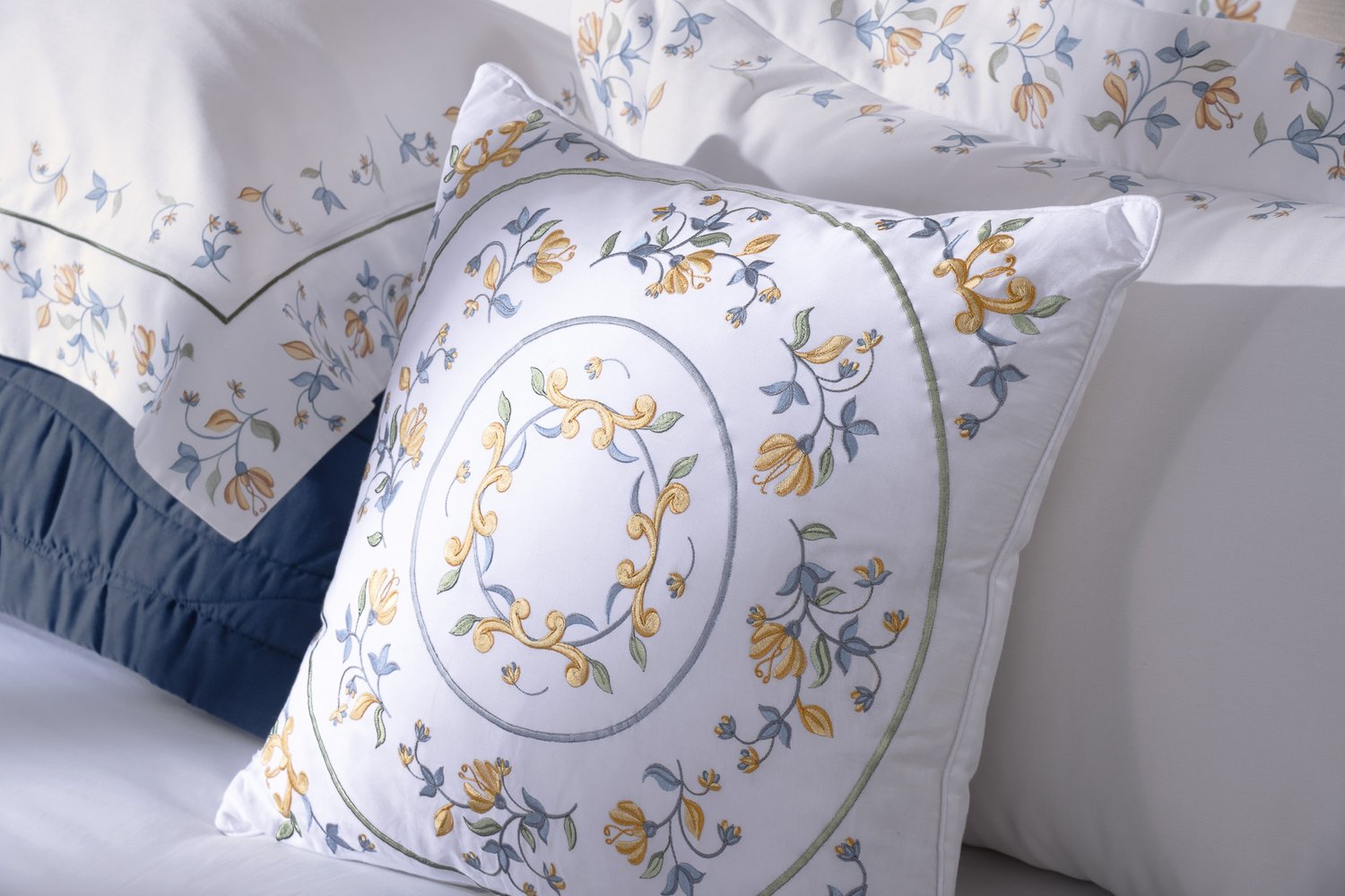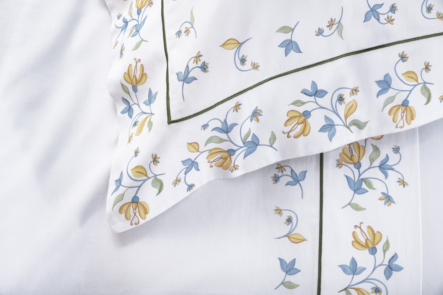 As cerâmicas sicilianas são conhecidas por suas vibrantes pinturas, que refletem a rica herança cultural e histórica da ilha. São adornadas com desenhos que incluem elementos naturais, figuras mitológicas, cenas do cotidiano e motivos geométricos, em cores intensas como azul, amarelo, verde e, em alguns casos, vermelho o que confere às peças um aspecto alegre e festivo. A estamparia digital do jogo de cama Taormina, pintada à mão em aquarela, leva não apenas o nome da cidade, mas todo o seu contexto cultural cerâmico, trazendo uma vivacidade encantadora para o dia a dia.
