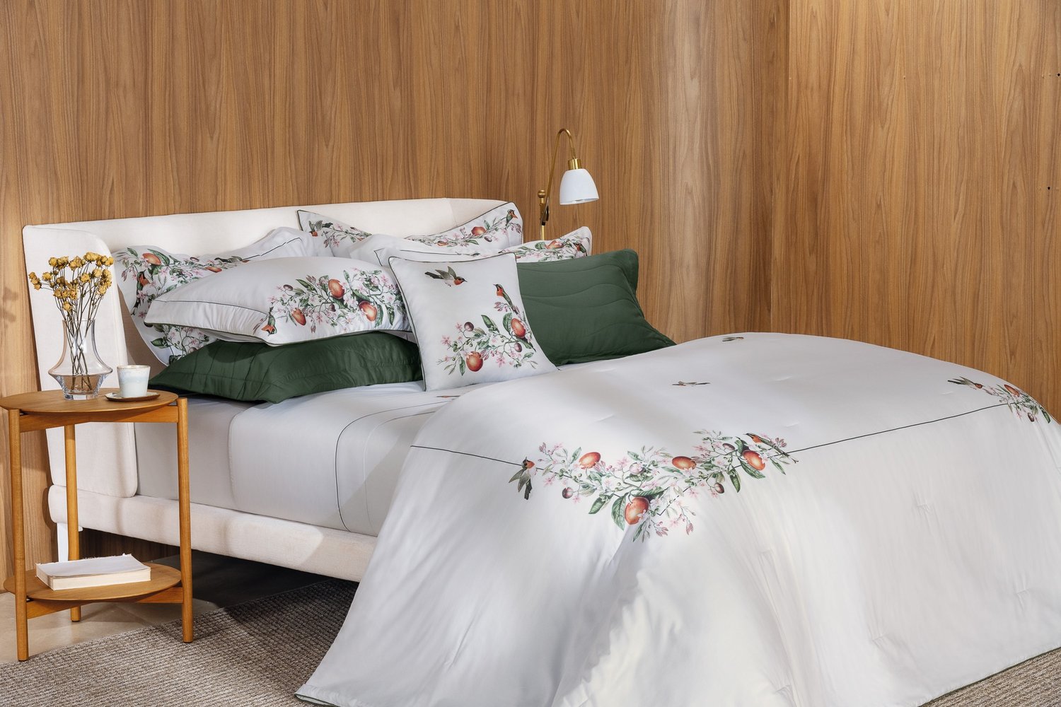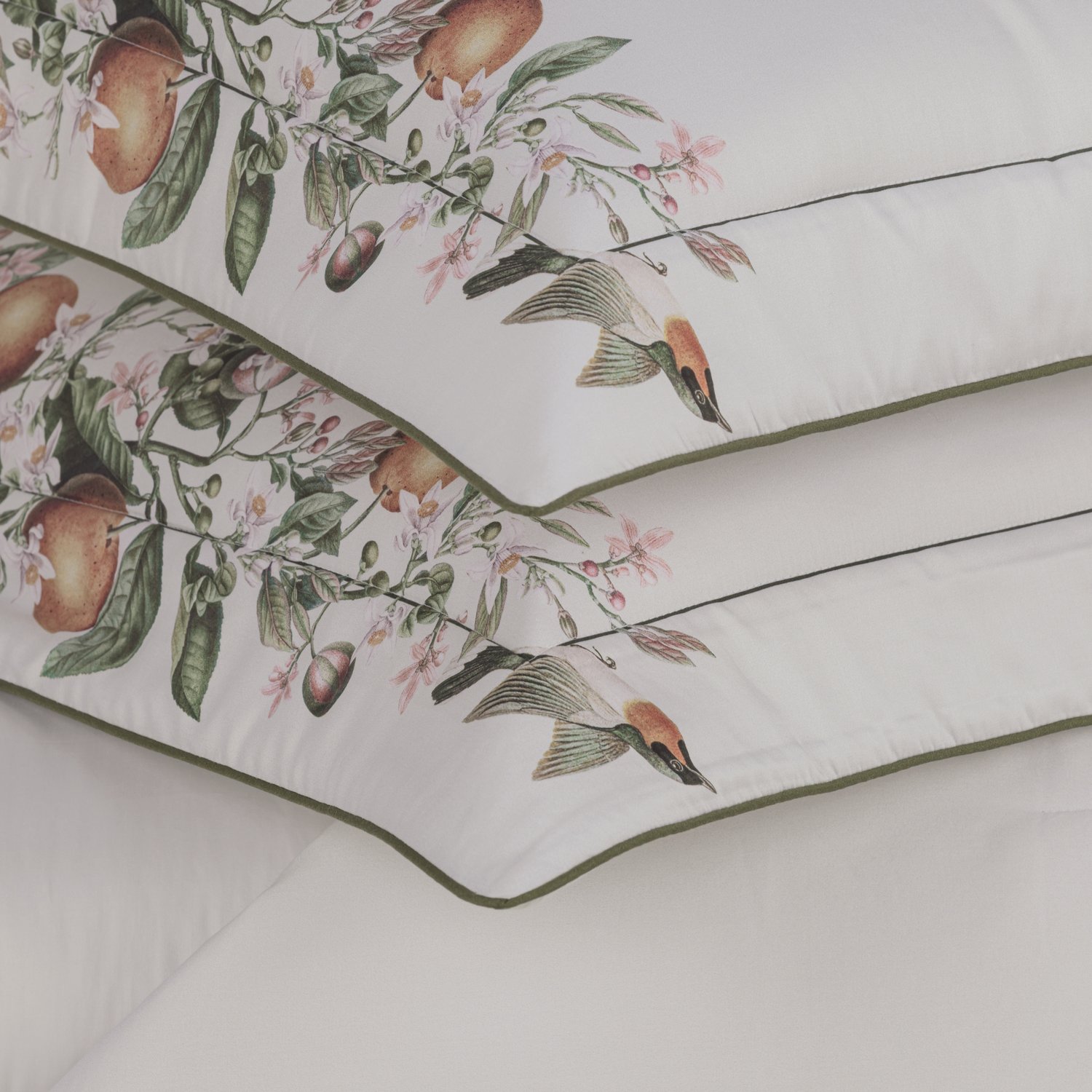 As laranjas sicilianas, com sua doçura irresistível e aroma marcante, trazem à mente a essência vibrante do Mediterrâneo. A variedade Sanguinella, com sua polpa avermelhada, é um verdadeiro tesouro da natureza. Inspirados por essa fruta encantadora, desenvolvemos o jogo de cama Arancia, cuja estamparia digital captura a alegria dos pássaros dançando entre as laranjeiras. Cada peça transforma o ambiente em um espaço acolhedor e repleto de vida, trazendo a harmonia e a luminosidade sicilianas para dentro do seu lar.