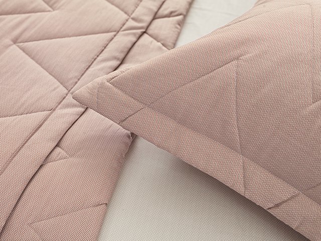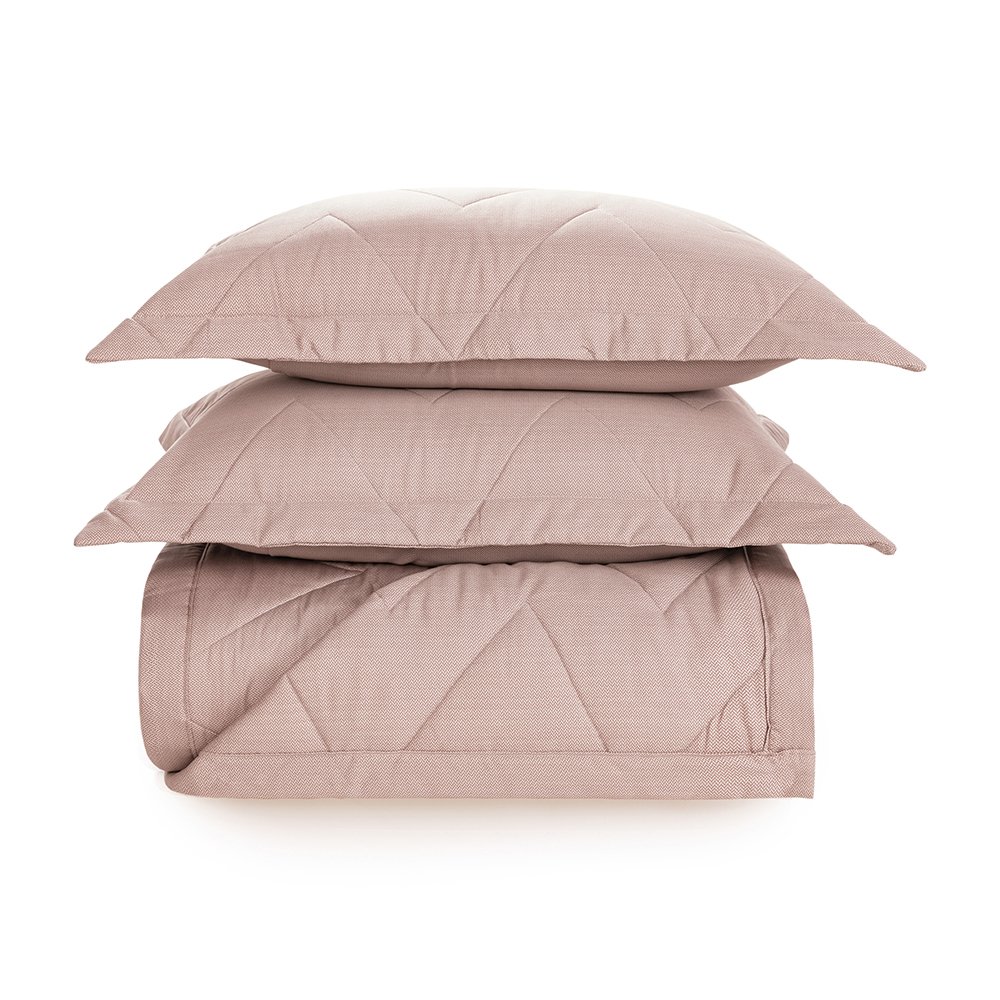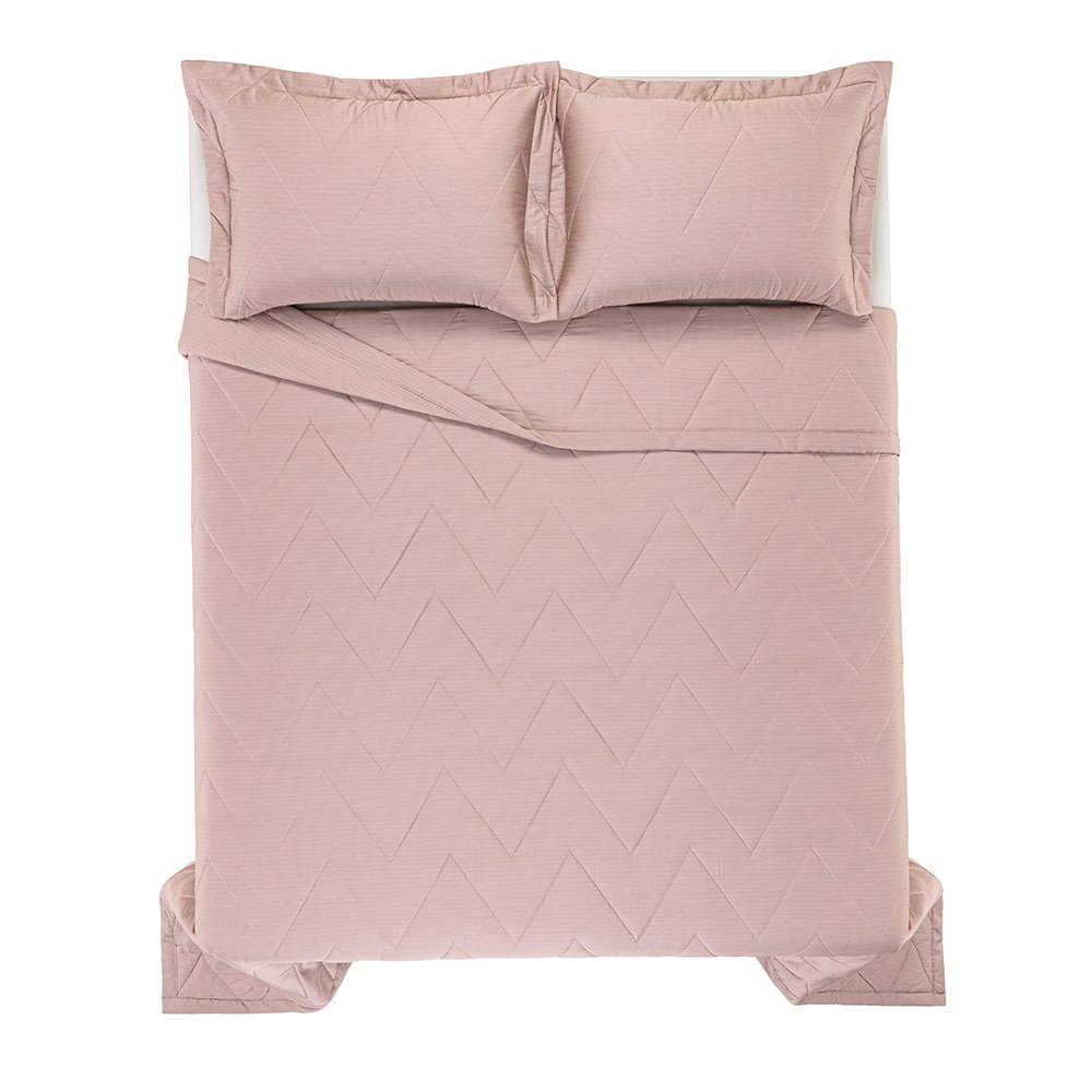 Possui acabamento mercerizado, que fortalece o algodão, mantendo sua qualidade por mais tempo. A colcha e o porta travesseiro são estampados em tom terracota.