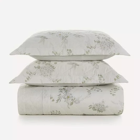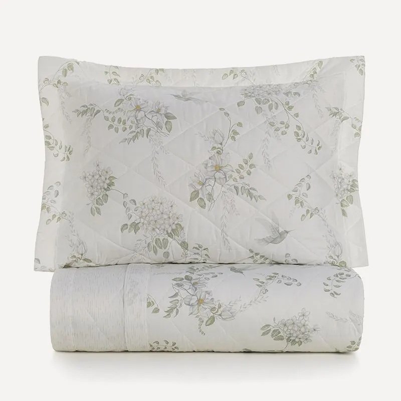 Confeccionado em algodão egípcio 300 fios, o jogo de colcha Laura oferece conforto térmico e caimento impecável. Inspirado na beleza natural das flores e na leveza do beija-flor, desenhados à mão, a colcha traz uma atmosfera serena e poética para o quarto. A colcha dupla face exibe estampa dimensionada em tons suaves e conta com acabamento termobond, que mantém o enchimento estável por mais tempo, mesmo após as lavagens. Os dois porta-travesseiros coordenados reforçam a harmonia da composição.