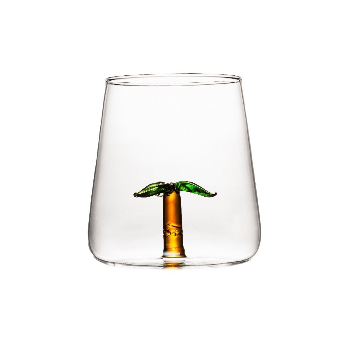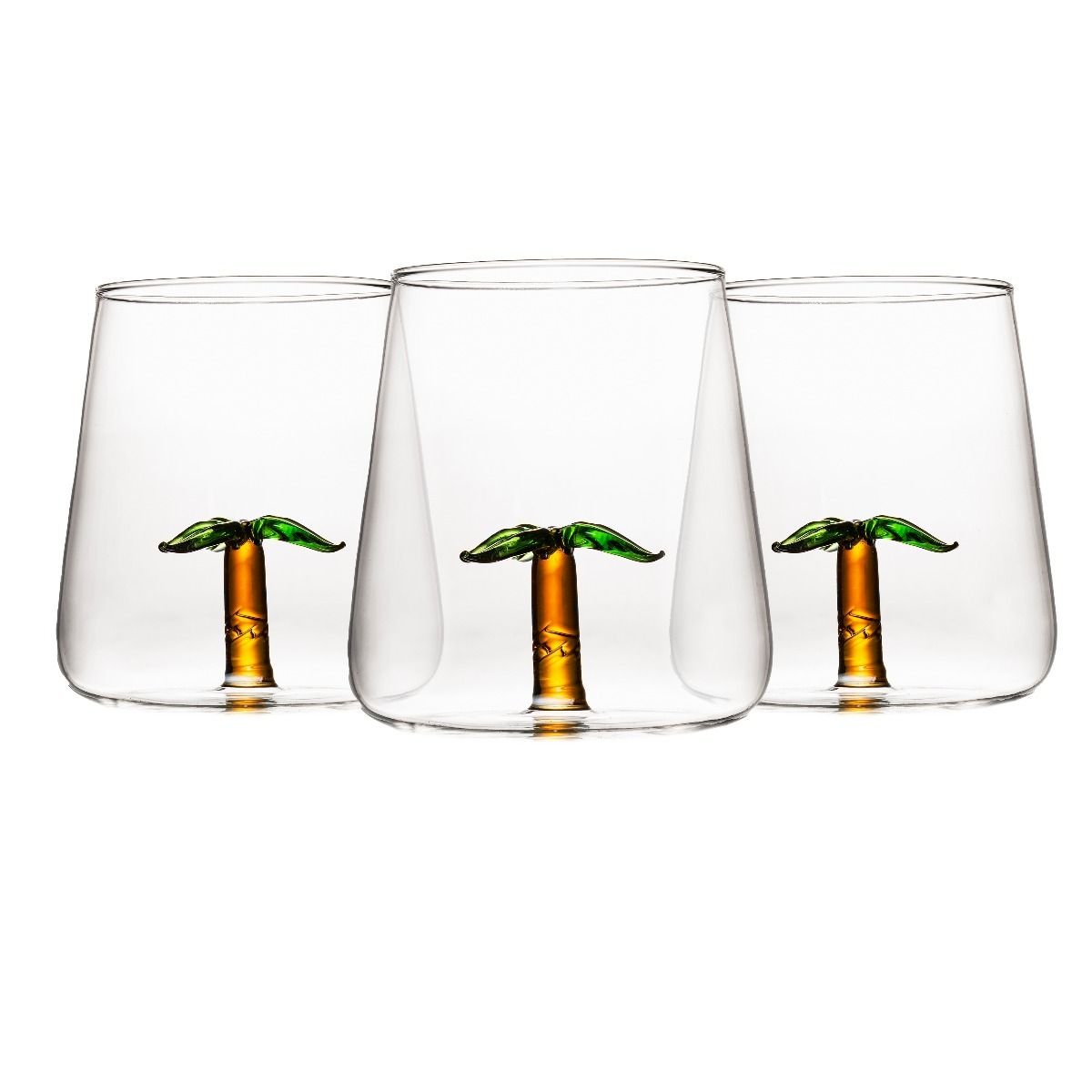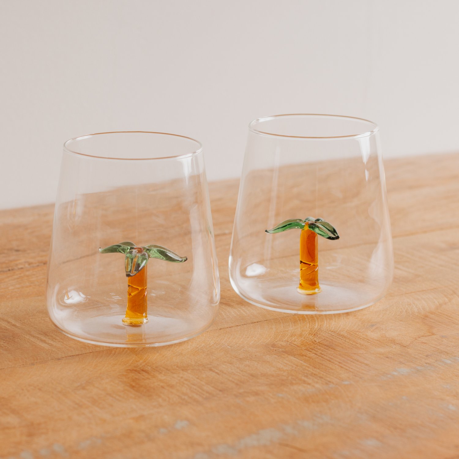 Jogo de 2 copos em vidro borossilicato com delicados coqueiros em vidro em seus interiores. Possuem capacidade para 450 ml e são ideais para servir bebidas ou decorar a cozinha.