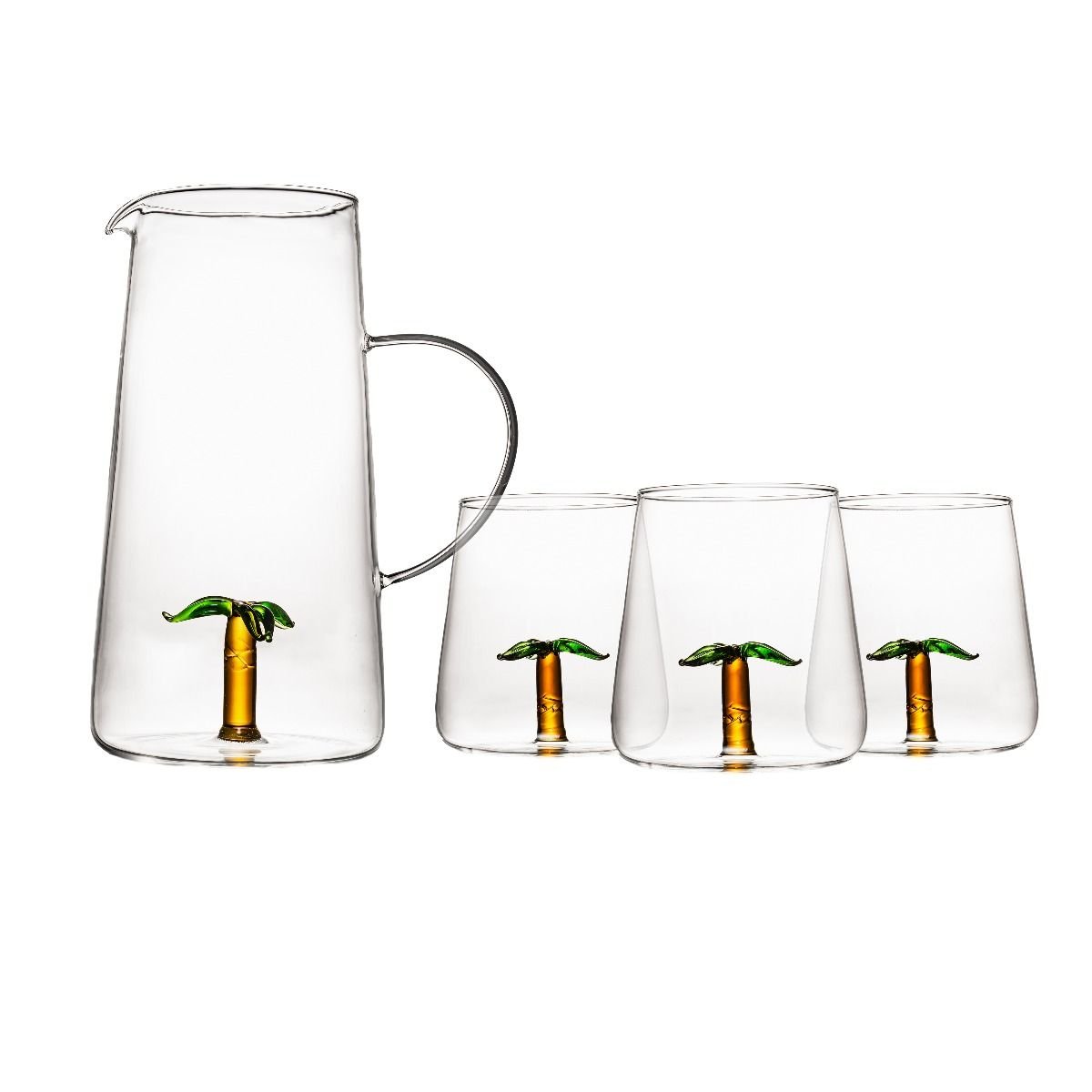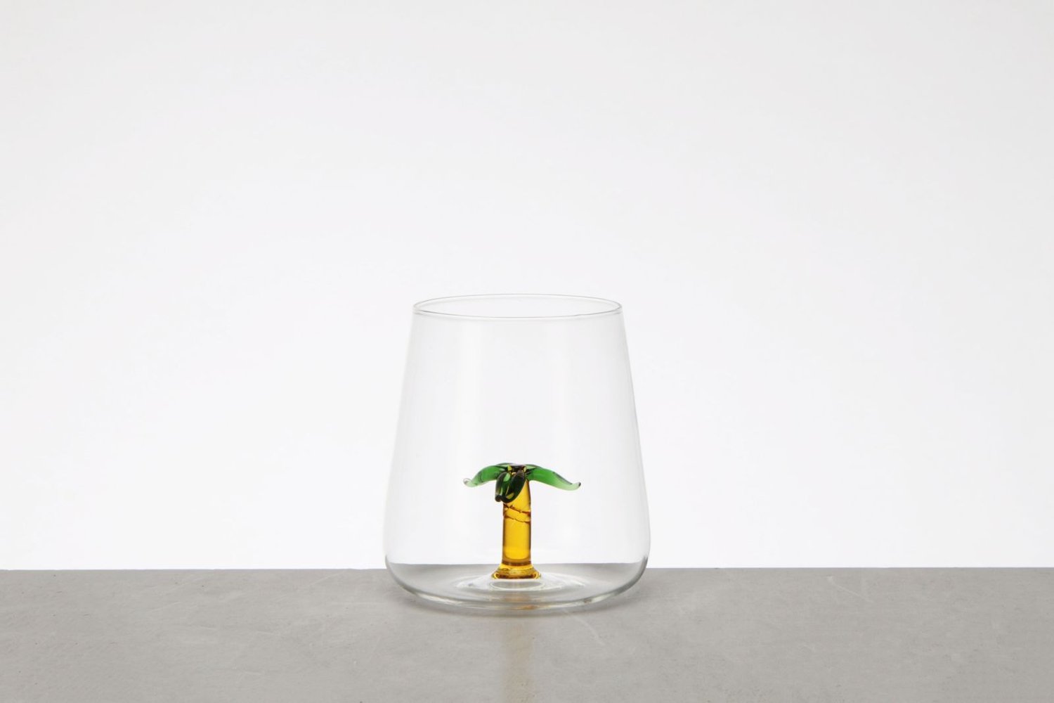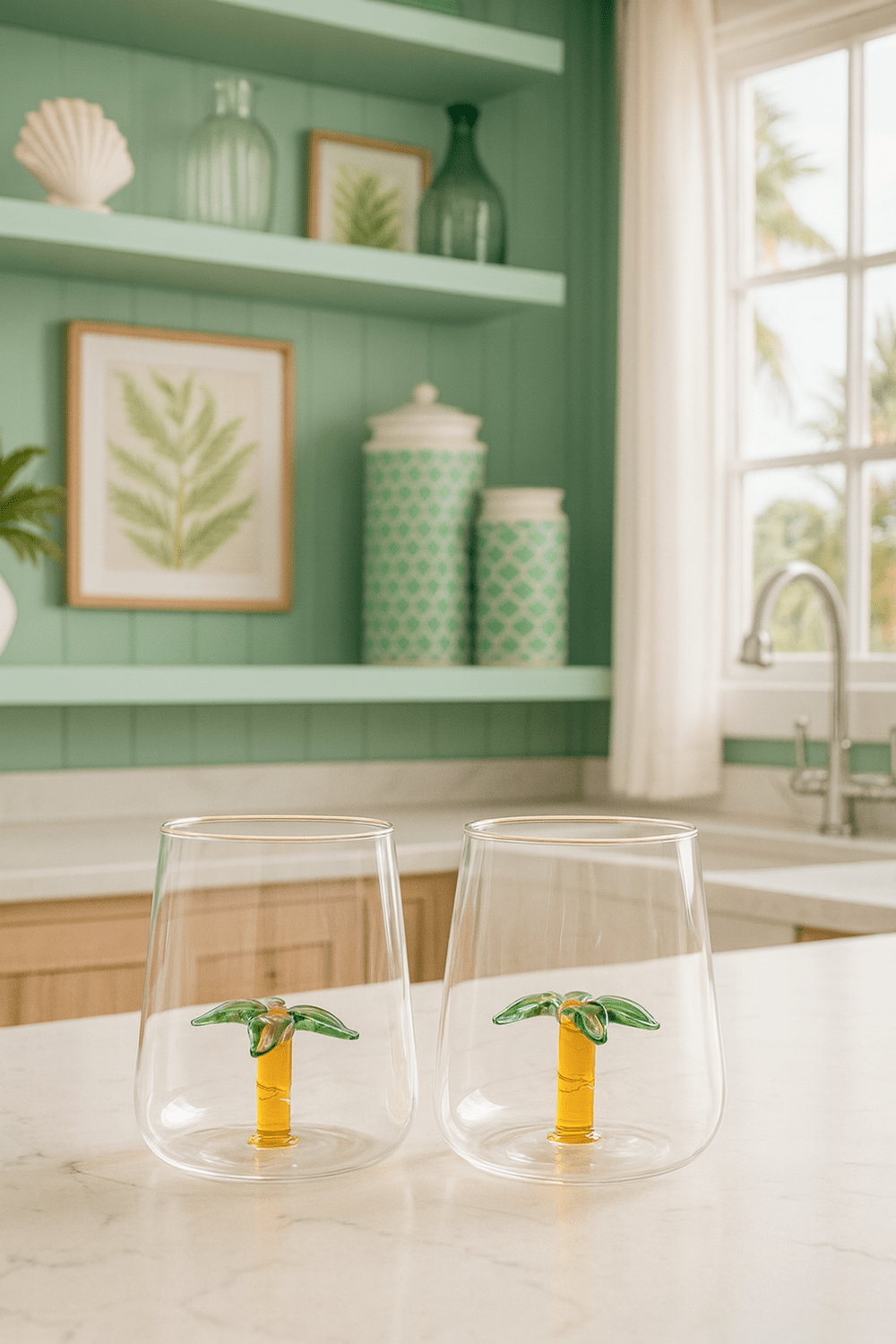 Jogo de 2 copos em vidro borossilicato com delicados coqueiros em vidro em seus interiores. Possuem capacidade para 450 ml e são ideais para servir bebidas ou decorar a cozinha.