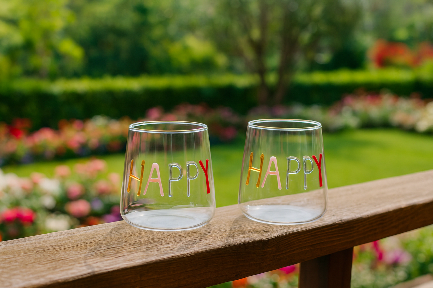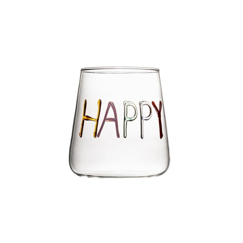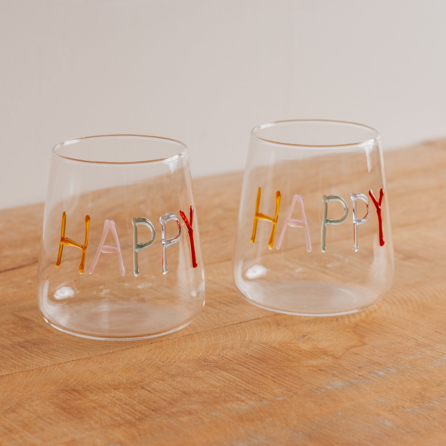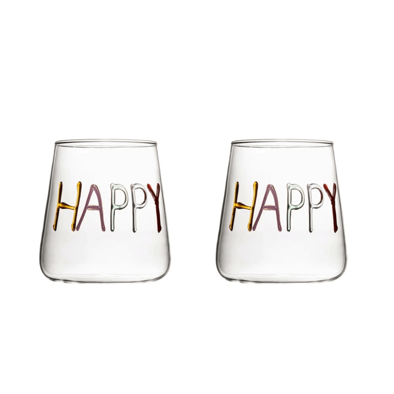 Jogo de 2 copos em vidro borossilicato com delicado alto relevo com a palavra HAPPY, que significa feliz, em inglês. Possuem capacidade para 450 ml e são ideais para servir bebidas ou decorar a cozinha.