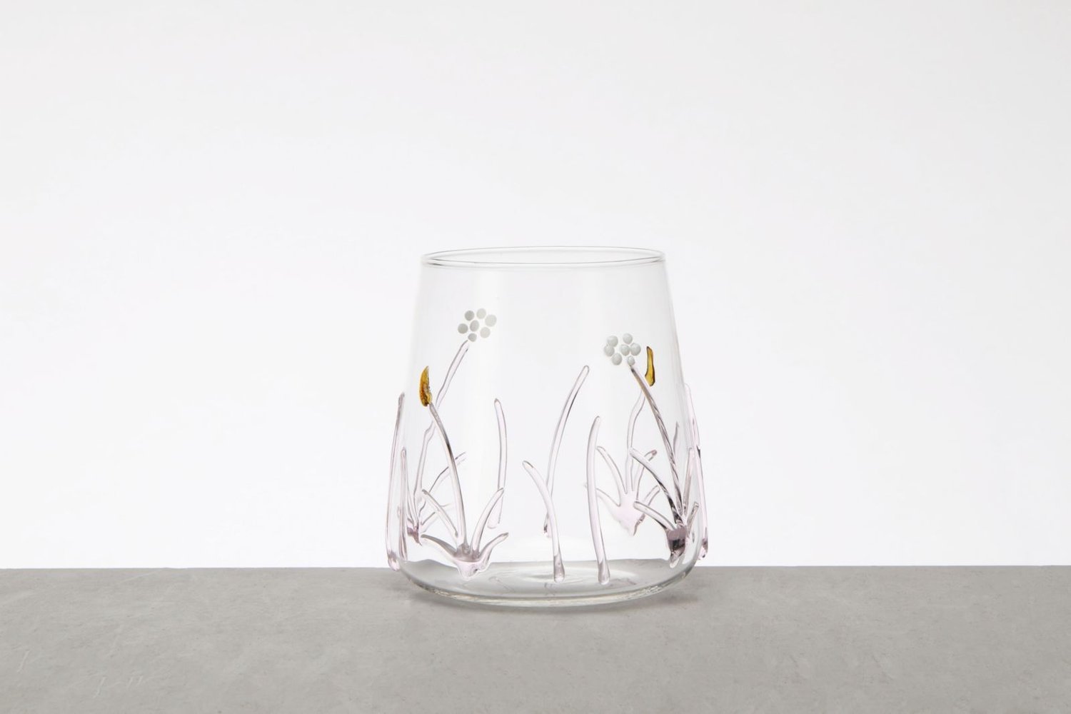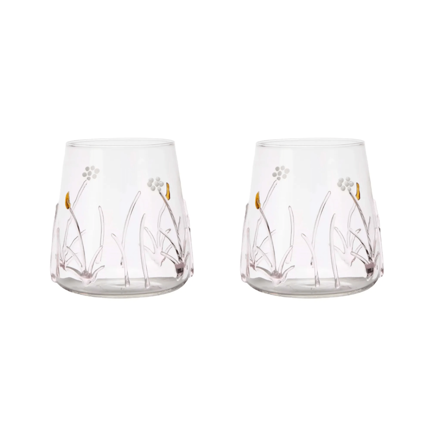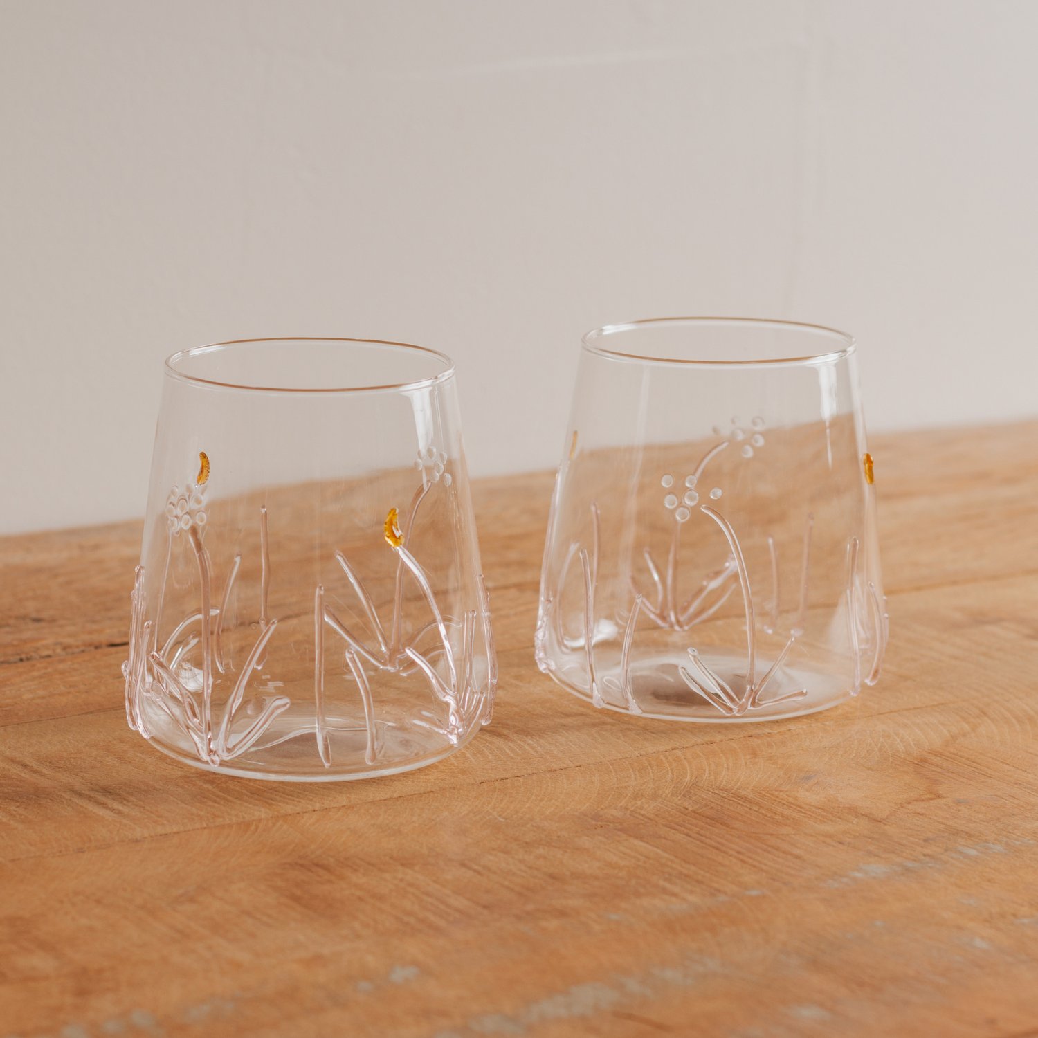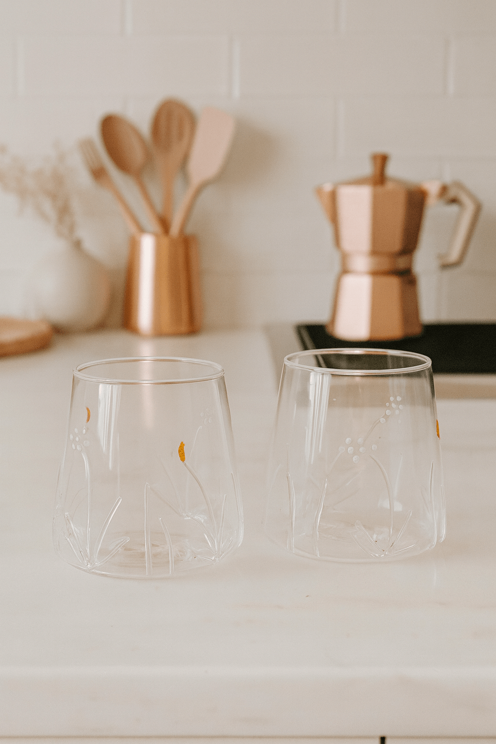 Jogo de 2 copos em vidro borossilicato com delicadas flores nas cores transparente, âmbar e rosa em alto relevo. Possuem capacidade para 400 ml e são ideais para servir bebidas ou decorar a cozinha.