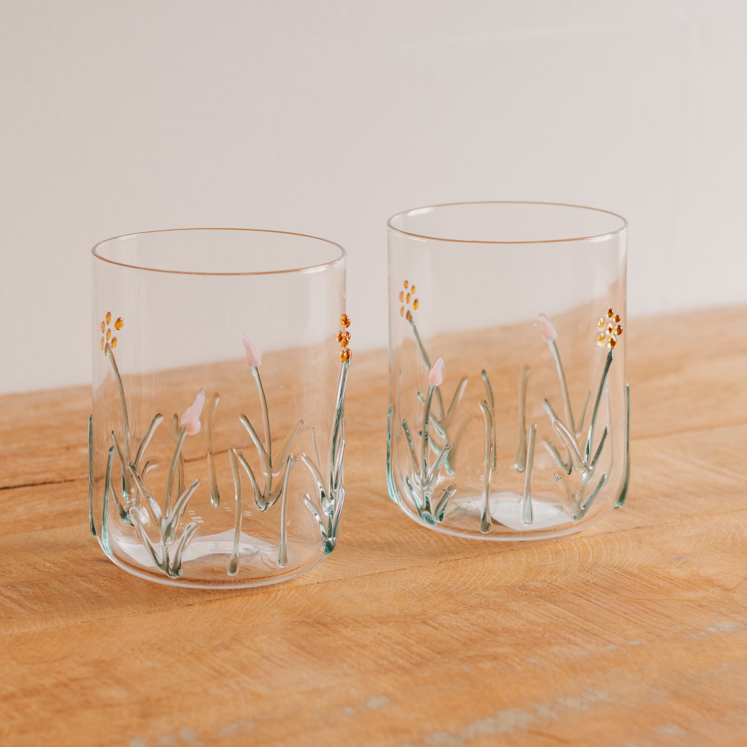 Jogo de 2 copos em vidro borossilicato com delicadas flores nas cores transparente, âmbar e rosa em alto relevo. Possuem capacidade para 450 ml e são ideais para servir bebidas ou decorar a cozinha.