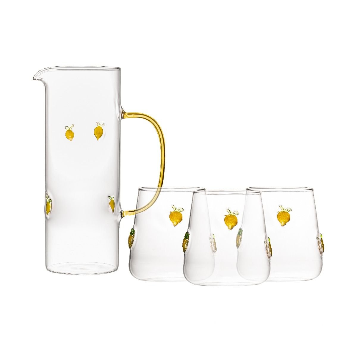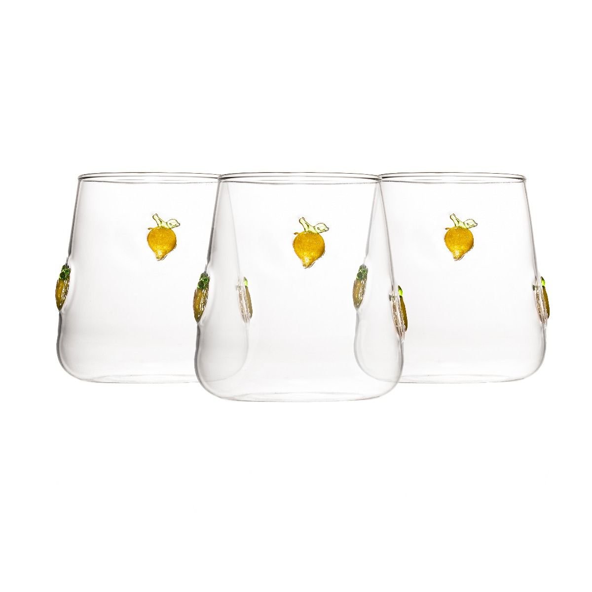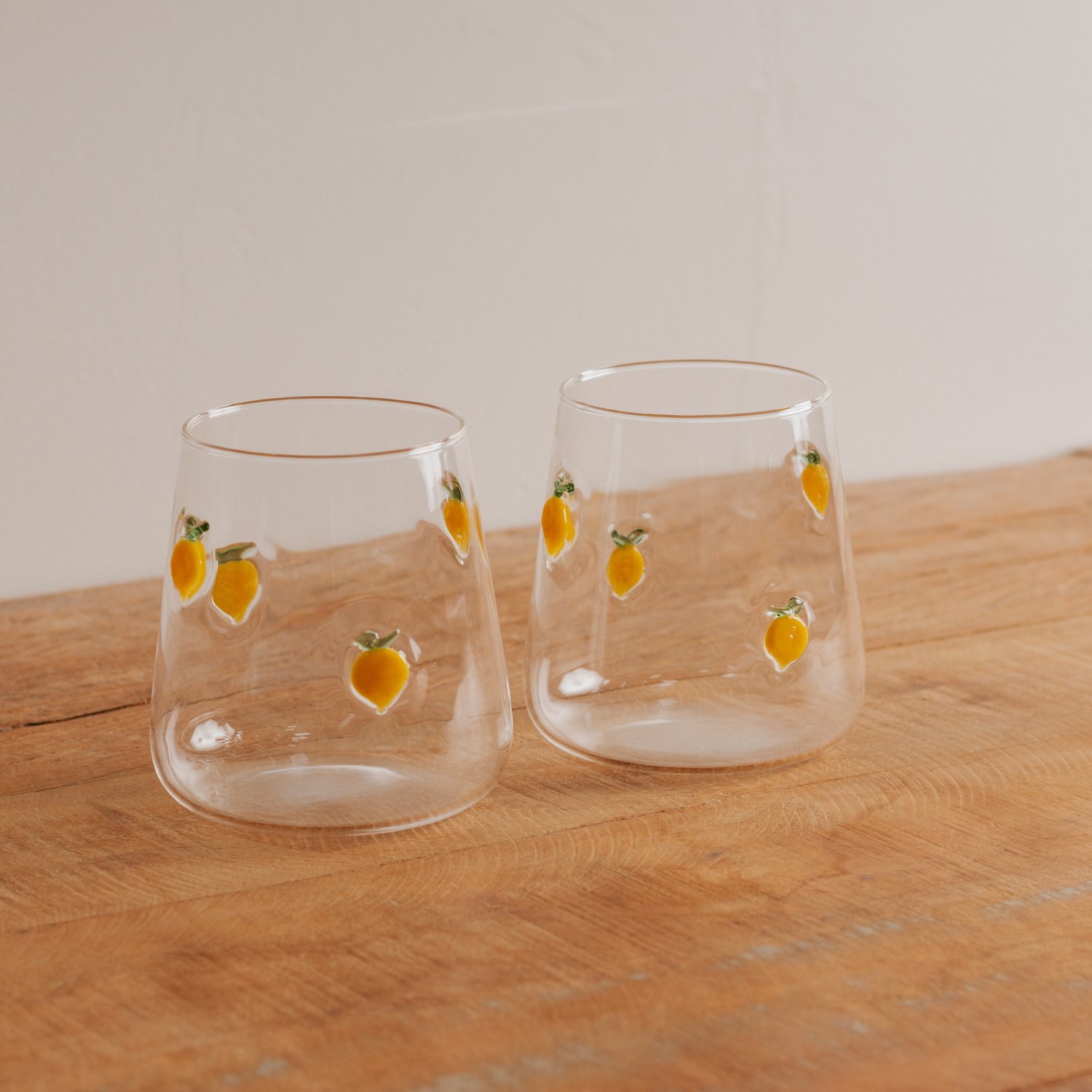 Jogo de 2 copos em vidro borossilicato com delicados limões sicilianos em alto relevo nas cores amarelo e verde. Possuem capacidade para 450 ml e são ideais para servir bebidas ou decorar a cozinha.