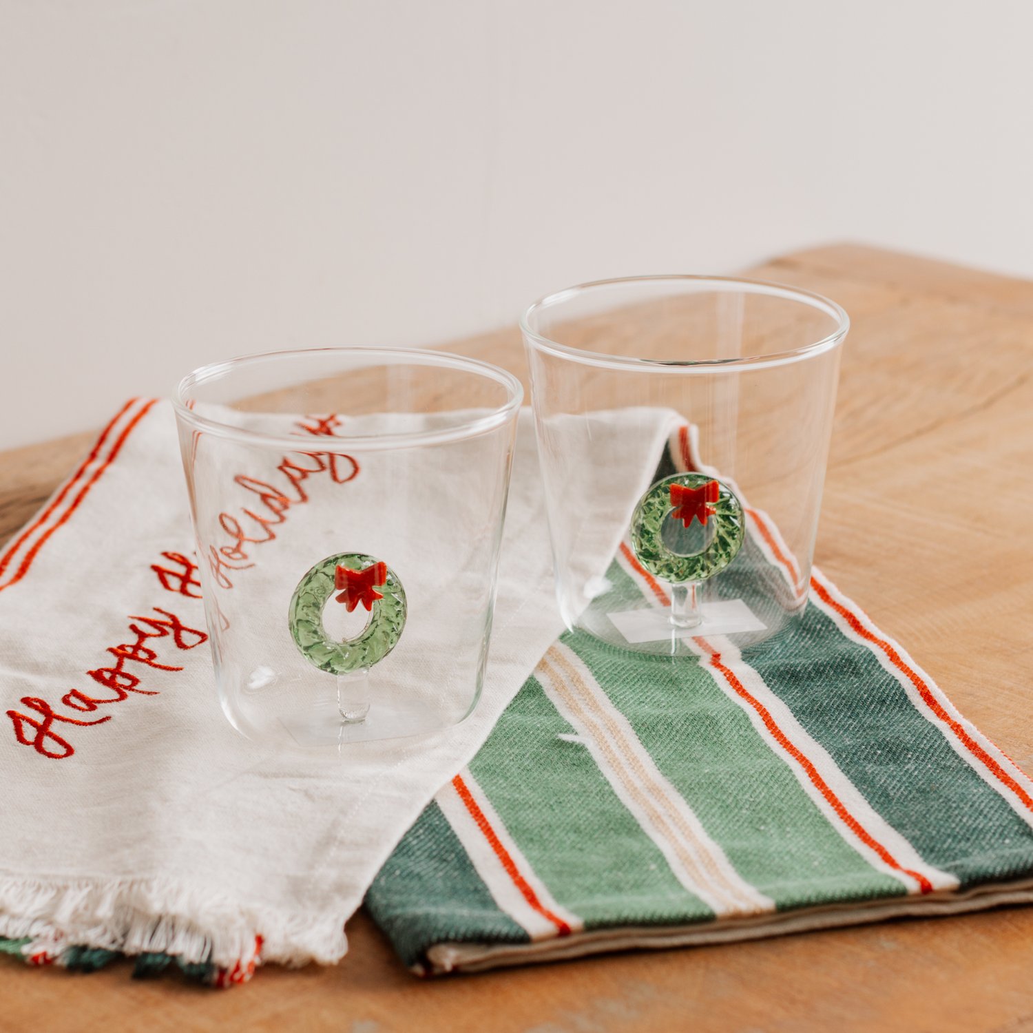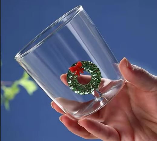 Jogo de 2 copos em vidro borossilicato com motivo de Natal e delicadas guirlandas em seus interiores. Possuem capacidade para 300 ml e são ideais para servir bebidas ou decorar a cozinha.