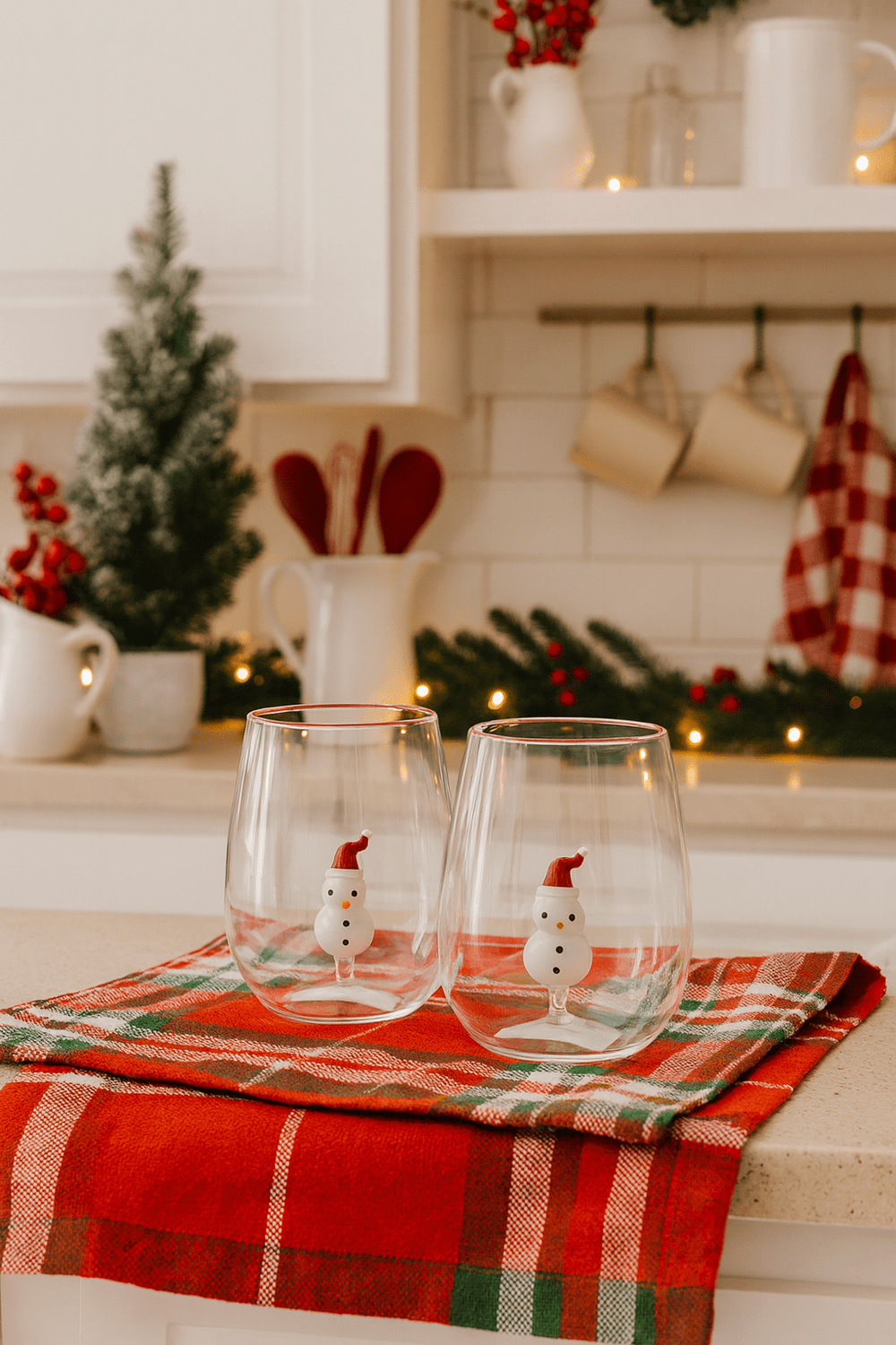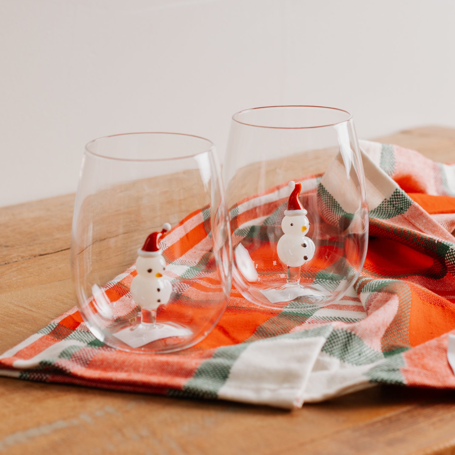 Jogo de 2 copos em vidro borossilicato com motivo de Natal e delicados bonecos de neve em seus interiores. Possuem capacidade para 450 ml e são ideais para servir bebidas ou decorar a cozinha.