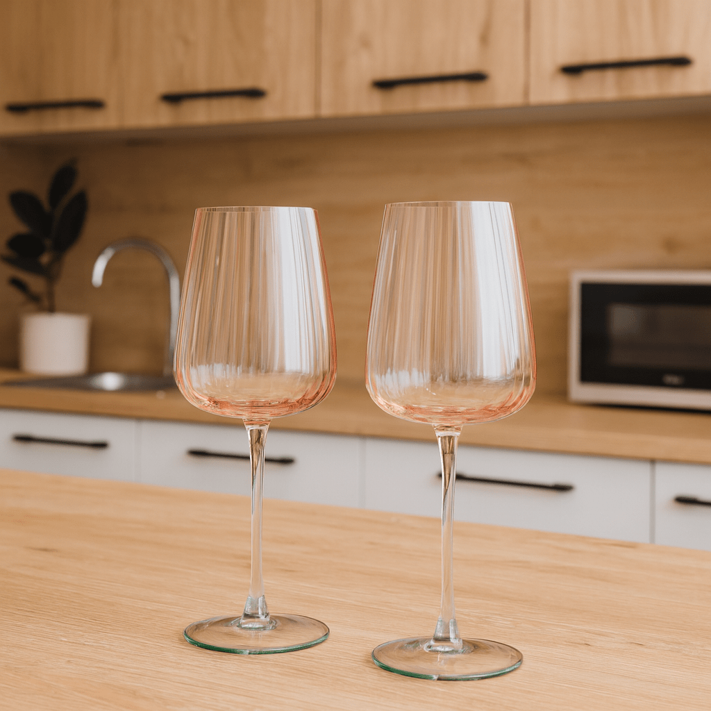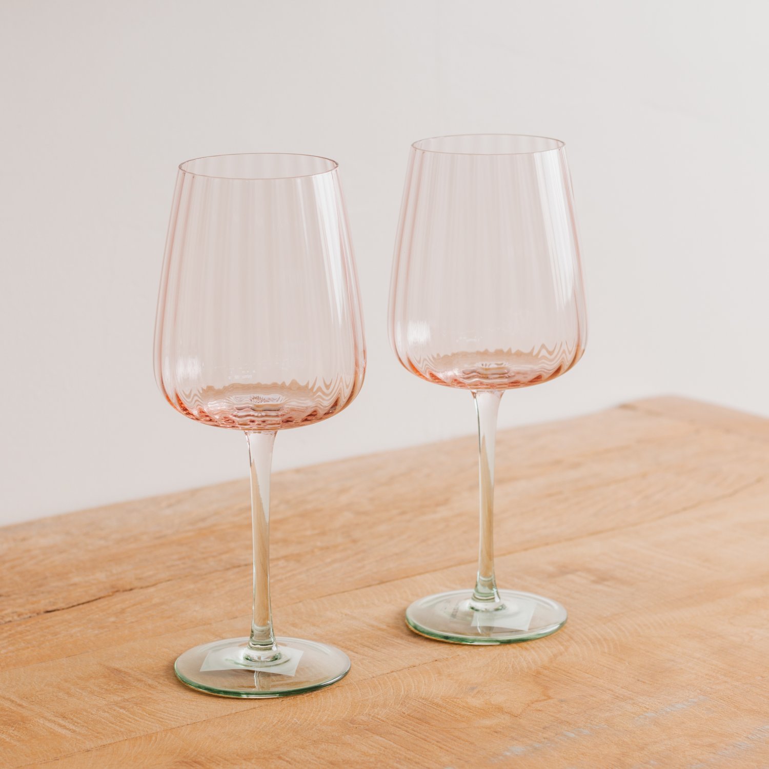 Jogo de 2 taças de água ou vinho em vidro trabalhado nas cores verde e rosa. Possuem capacidade para 420 ml e são ideais para servir bebidas como água, suco ou vinho ou utilizar como peça decorativa na cozinha ou bandeja.