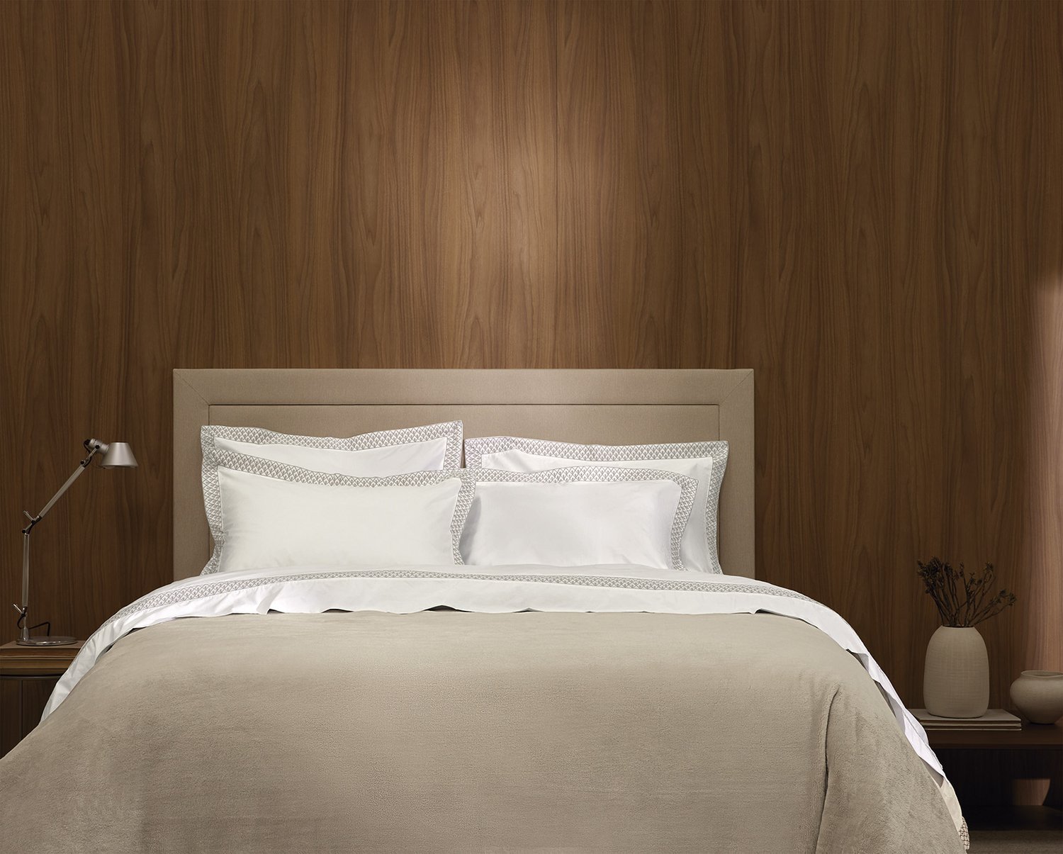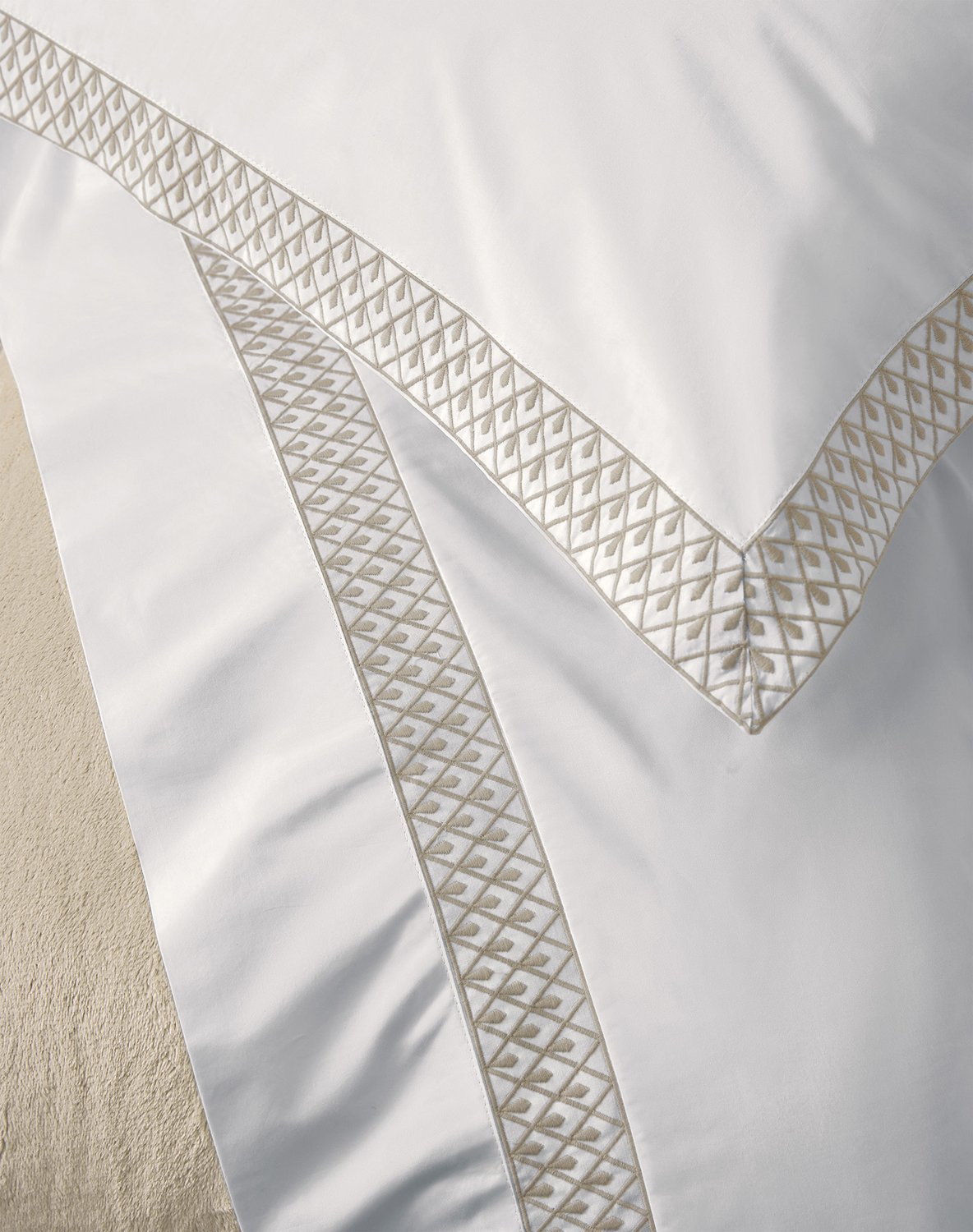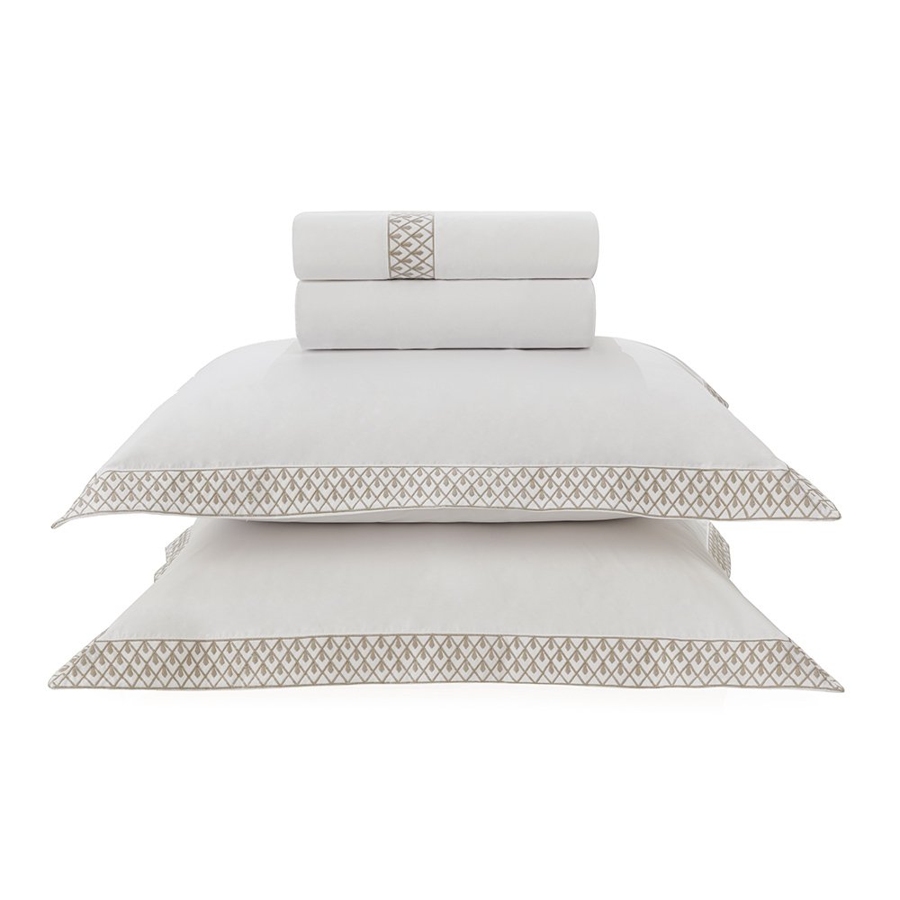 O sublime bordado da cama Andreani aplicado na aba, retrata a arquitetura contemporânea dos prédios mais icônicos do bairro Porta Nuova em Milão. As linhas retas em formato de triângulo, formam pingentes, resultando em uma bela joia, com requinte e elegância. Peças clássicas que oferecem conforto e beleza.