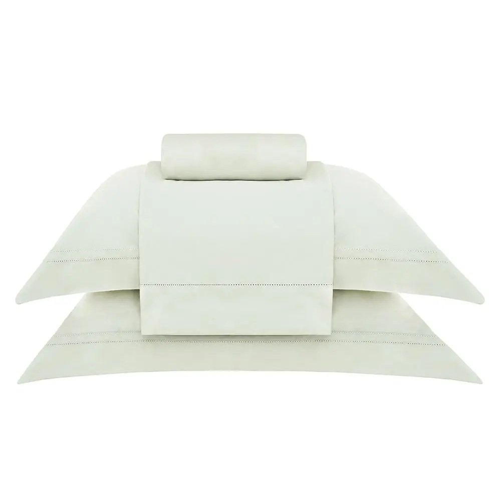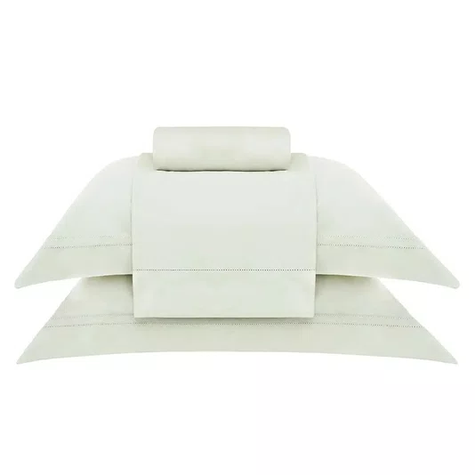 Cor: Verde Mousse Marca: Buddemeyer Luxus Conteúdo: 1 sobrelençol 240cm x 280cm / 1 lençol 160cm x 200cm x 40cm / 2 fronhas 50cm x 70cm Composição: tecido 600 fios / 100% algodão / fio penteado Tipo de Material: tecido 600 fios / 100% algodão / fio penteado Instruções de Cuidado: Cores escuras devem ser lavadas separadas das cores claras / Lavar em água fria ou em temperatura de até 60°C / O melhor sabão para manter as características do produto é o de coco ou neutro / Não colocar sabão diretamente no produto / Evite alvejantes e quaisquer produtos a base de cloro, eles atacam o corante dos tecidos / Não exagere no uso de sabão em pó e use pouco amaciante / Permite secadora em temperatura baixa / Temperatura máxima da base do ferro 110°C / Não usar ferro a vapor / Não lavar a seco