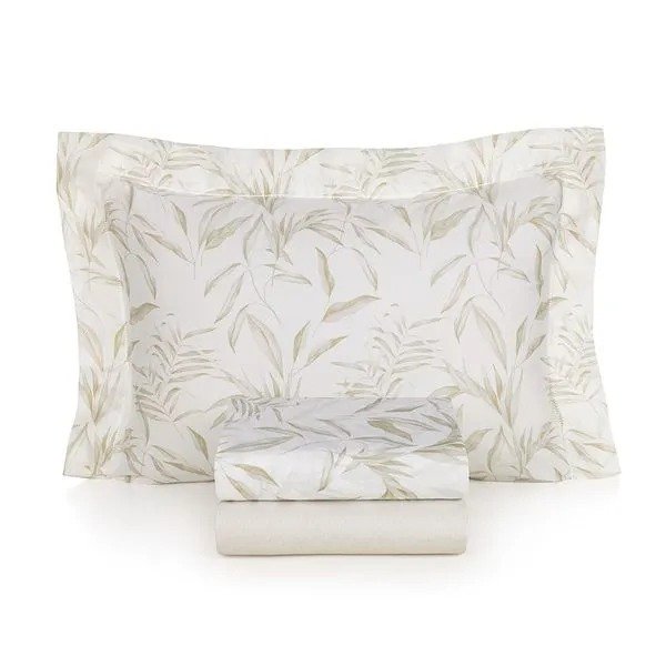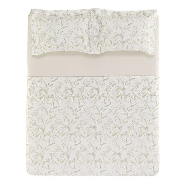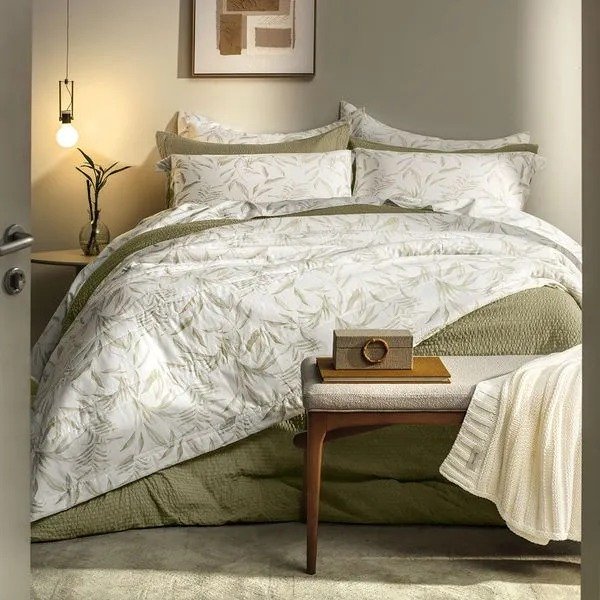 Combinação de Cores: Lençol com micro estampa, fronha e sobre lençol com folhagens em tons suaves de verde. |