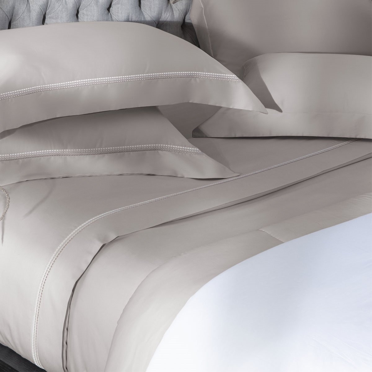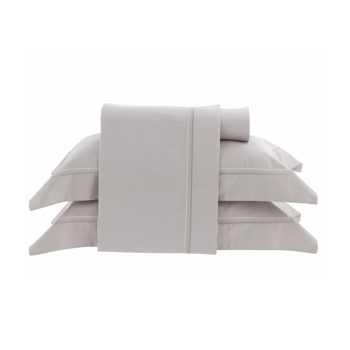 Confeccionado em percal 300 fios, 100% algodão egípcio, com toque de cetim, naturalmente hipoalergênico e possui um tratamento anti-pilling, ou seja, evita a formação de bolinhas.