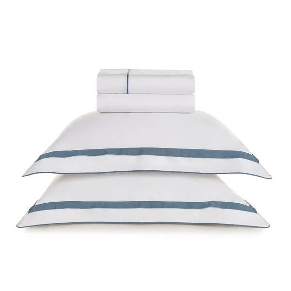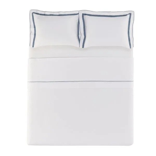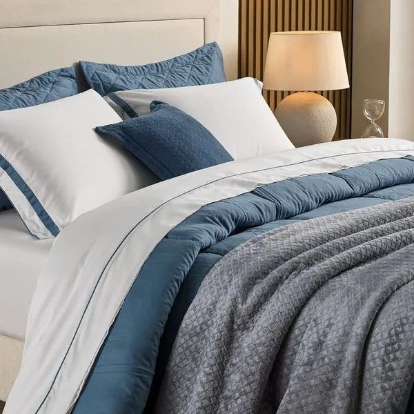 O Jogo de Cama Lara Queen é a opção ideal para quem valoriza aconchego. Produzido em 100% algodão egípcio com 300 fios, garante uma textura extremamente macia e resistência excepcional. Seu tecido, composto por fibras longas e altamente respirável, oferece caimento impecável e é hipoalergênico, perfeito para noites de descanso pleno. O conjunto é composto por: um sobre lençol com vira de pala de 10 cm e detalhe de filete aplicado com medidas 2,40m x 2,60m, lençol com elástico 1,60m x 2,00m x 40cm em cor sólida, e duas fronhas 50cm x 70cm com 3 abas de 7 cm, acabamento com sobreposição de 2,5cm e aplicação de cordonê em três lados. A combinação de branco e azul adiciona um toque de sofisticação moderna, harmonizando perfeitamente com o edredom e o jogo de colcha da mesma coleção.