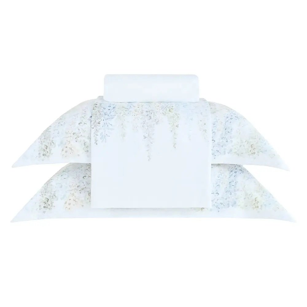 Elegantes cachos de glicínias, inspirados na arte impressionista, despontam no sobrelençol e fronhas como um magnífico jardim secreto. Jogo de cama Buddemeyer Luxus Lila, produzido em cetim 400 fios 100% algodão, com fios penteados. Exclusividade Buddemeyer Luxus.