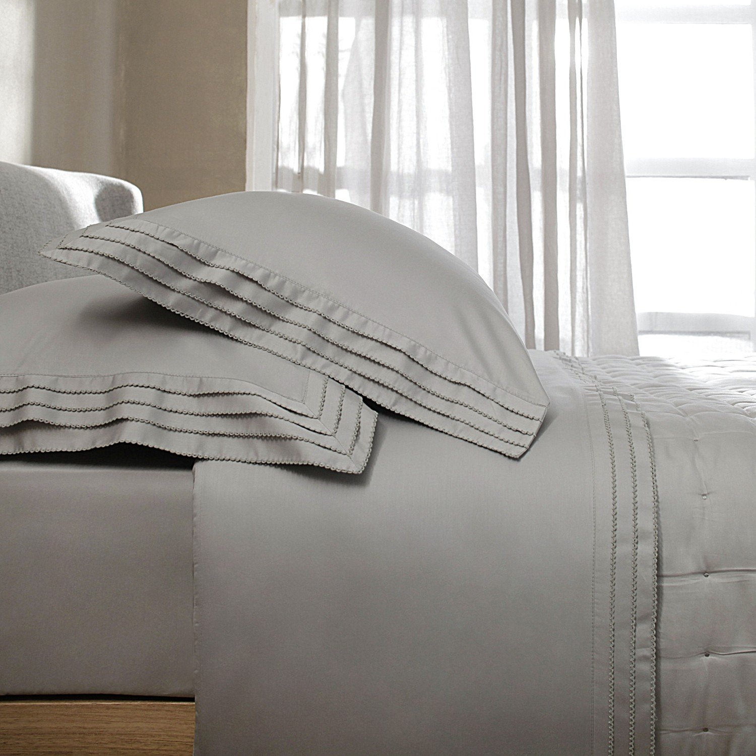 Fronhas dispõe de abas nos três lados e o lençol possui elástico. Jogo de cama Buddemeyer Luxus Palladio, produzido em cetim 400 Fios, 100% algodão fio penteado. Exclusividade Buddemeyer Luxus