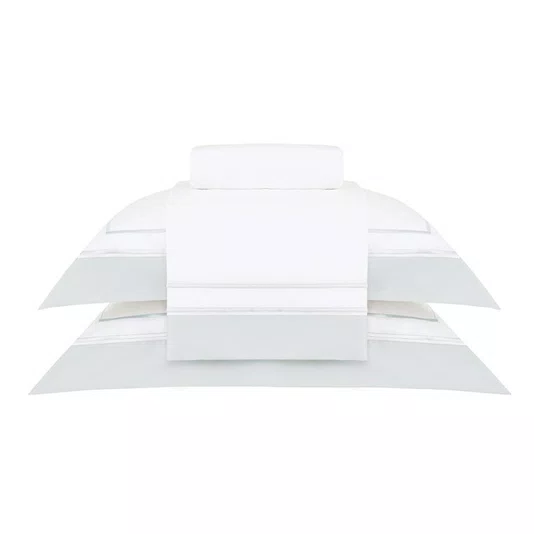 Cor: Branco/Verde Glace Marca: Buddemeyer Luxus Conteúdo: 1 sobrelençol 260cm x 290cm / 1 lençol com elástico 160cm x 200cm x 45cm / 2 fronhas 50cm x 70cm Composição: 100% algodão fio penteado Tipo de Material: 100% algodão fio penteado Instruções de Cuidado: Cores escuras devem ser lavadas separadas das cores claras / Lavar em água fria ou em temperatura de até 60°C / O melhor sabão para manter as características do produto é o de coco ou neutro / Não colocar sabão diretamente no produto / Evite alvejantes e quaisquer produtos a base de cloro, eles atacam o corante dos tecidos / Não exagere no uso de sabão em pó e use pouco amaciante / Permite secadora em temperatura baixa / Temperatura máxima da base do ferro 110°C / Não usar ferro a vapor / Não lavar a seco