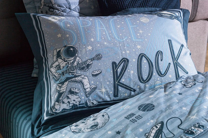 Informações do Produto: Marca Karsten Linha Espacial Composição 100% algodão, 200 fios Itens Inclusos Sobre lençol estampado com dobra feita, Lençol com elástico estampado, 1 Fronha Tamanho Sobre lençol estampado 1,80m x 2,50m, Lençol com elástico 1,00m x 2,00m x 35cm, Fronha 50x70 Acabamento Estampa espacial que brilha no escuro