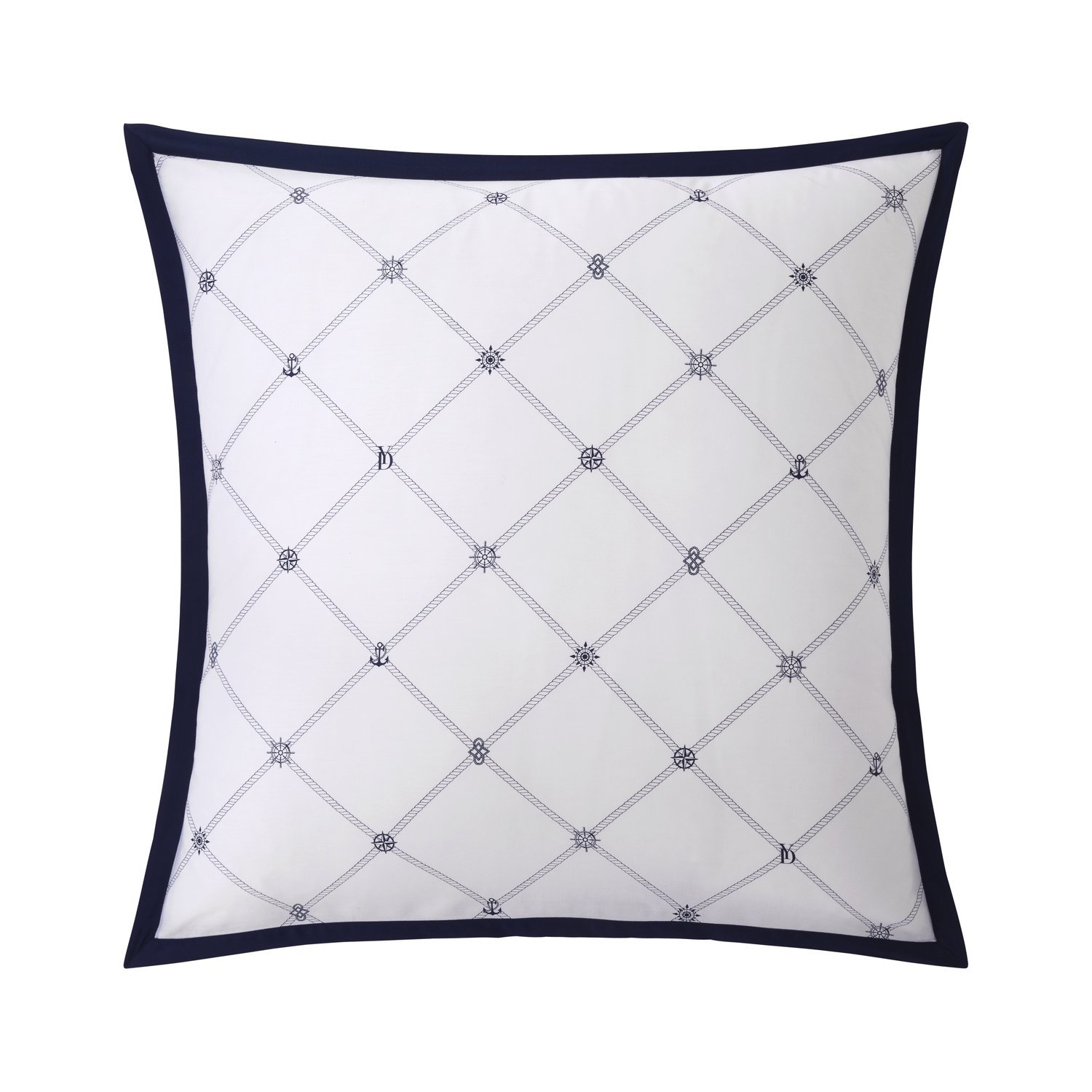 A linha encre possui emblemas marítimos em azul com a logo YD ao centro estampado no tecido acetinado branco. Esta coleção possui o verso das fronhas e capa de duvet em azul, possibilitando diferentes composições. Estampa com design elegante e atemporal.