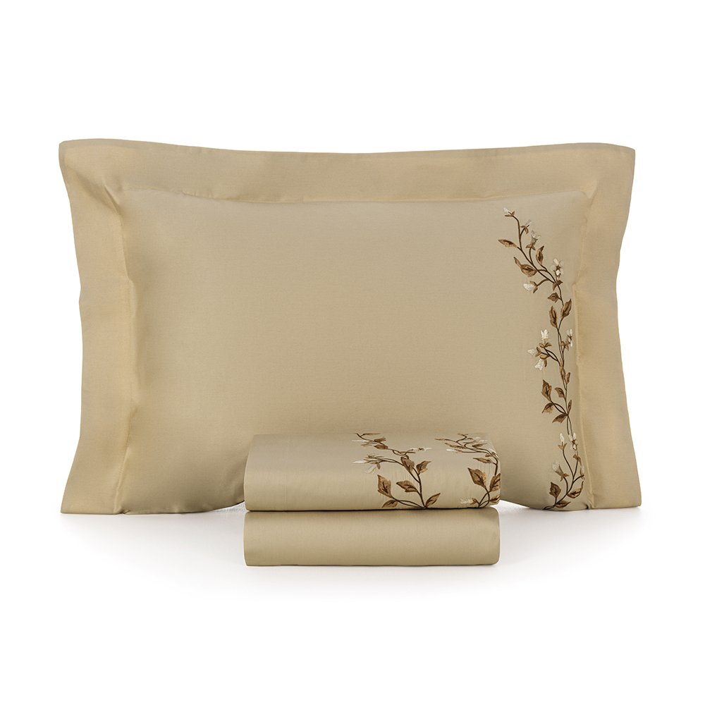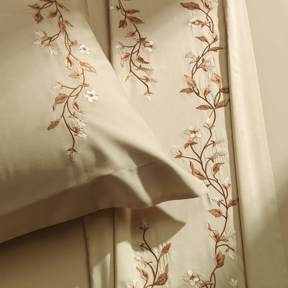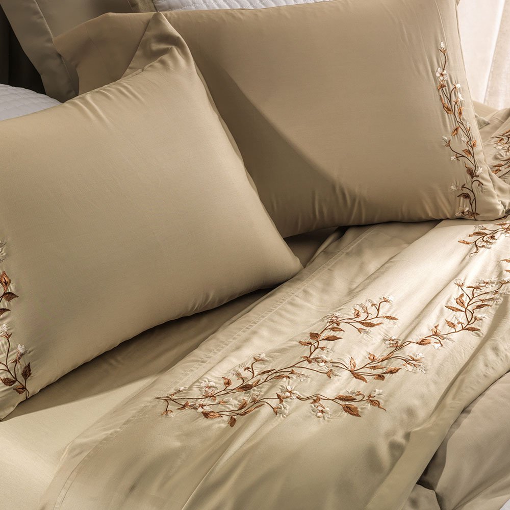 O Jogo de Cama Carmela é pensado para quem aprecia elegância sutil e conforto no dia a dia. Com detalhes florais delicadamente bordados nas fronhas e na dobra do sobre lençol, ele adiciona um toque de charme ao ambiente sem exageros. A paleta em tons naturais e terrosos contribui para uma sensação de tranquilidade, tornando o quarto mais aconchegante e convidativo. Confeccionado em algodão egípcio de 300 fios, o tecido é macio ao toque, respirável e ideal para proporcionar noites mais agradáveis.