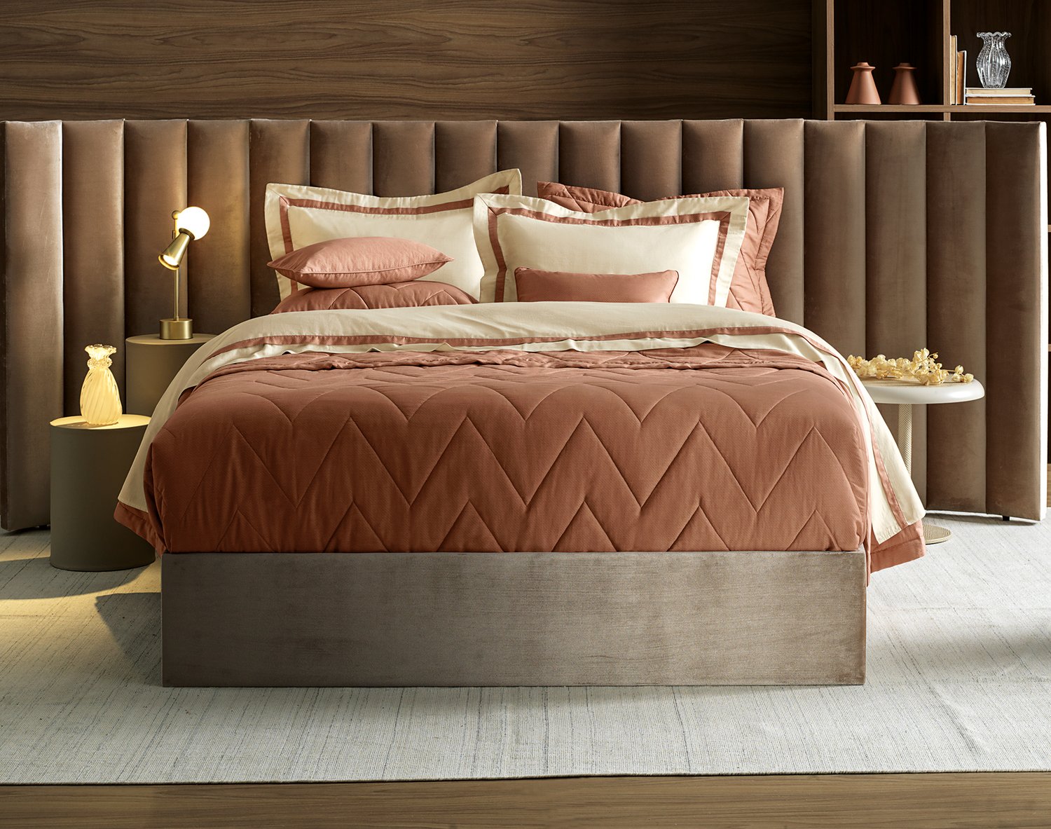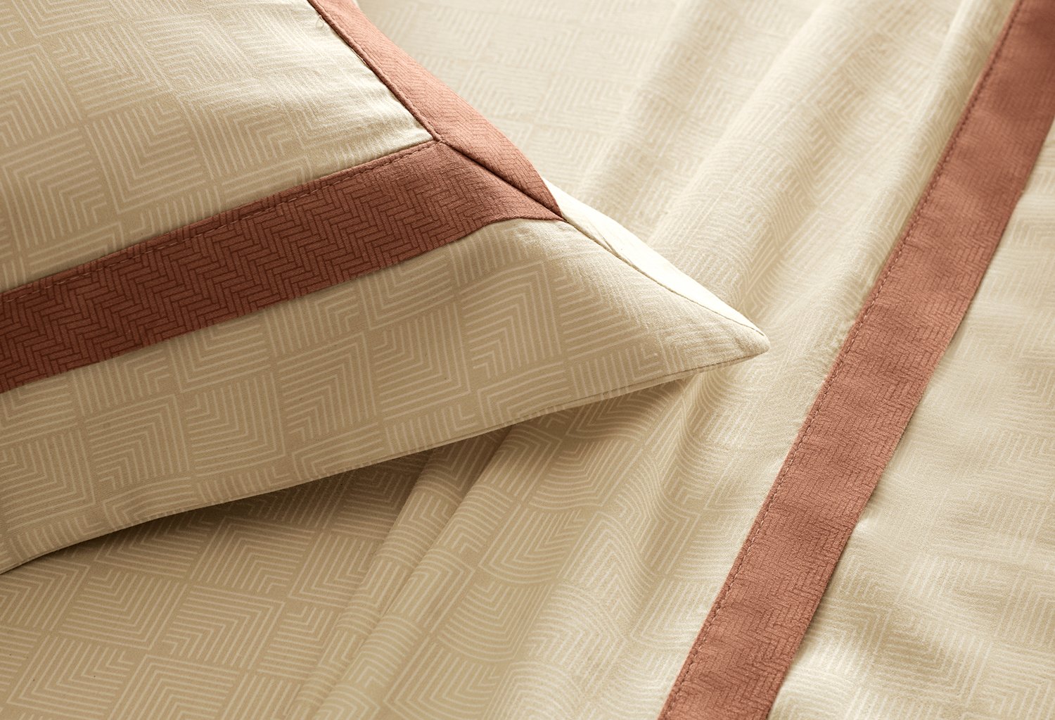 Acabamento: Cetim 300 Fios; Geometria leve e detalhes em terracota; Fronhas e dobra feita estampadas com aplicação de detalhe; Lençol estampado com detalhe.