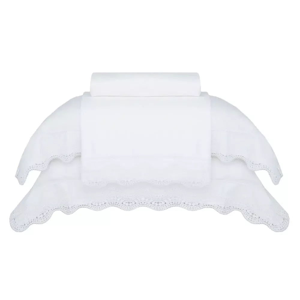 Informações do Produto Marca Buddemeyer Luxus Linha Gianni Cor Branco Material Tecido 400 fios - 100% algodão, fio penteado Acabamento Bordado guipure rico em detalhes formado por florais com acabamento scalloped Tamanho 1 sobrelençol 280x280cm + 1 lençol 193x203x45cm + 2 fronhas 50x70cm