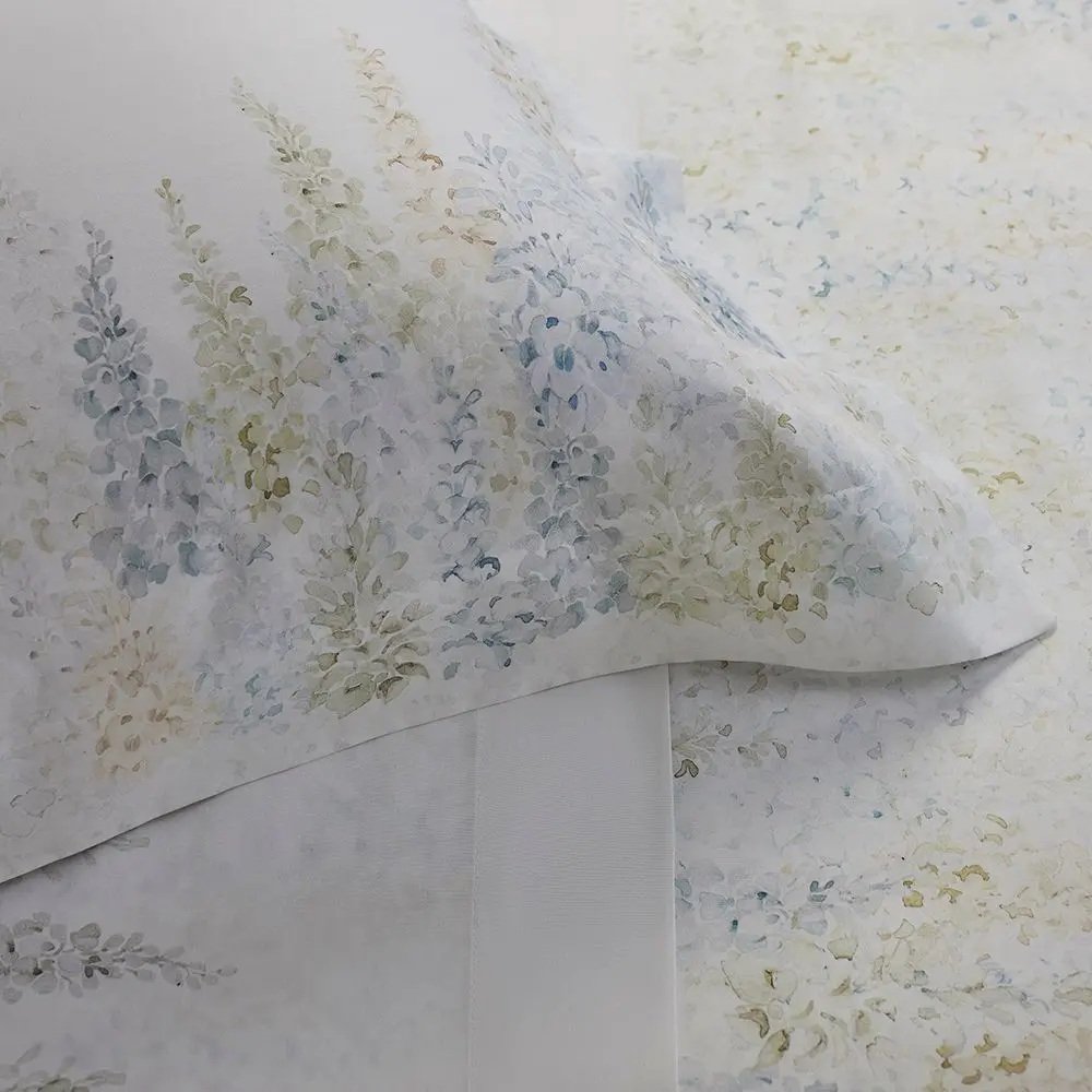 Elegantes cachos de glicínias, inspirados na arte impressionista, despontam no sobrelençol e fronhas como um magnífico jardim secreto. Jogo de cama Buddemeyer Luxus Lila, produzido em cetim 400 fios 100% algodão, com fios penteados. Exclusividade Buddemeyer Luxus.