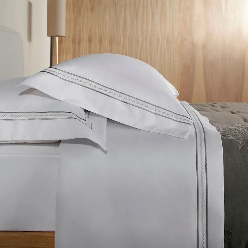 Jogo de cama Super King Trento - Buddemeyer Luxus. Surpreendente, única e muito luxuosa, a Coleção Trento possui rara e convidativa trama em 800 fios de algodão egípcio. Com a beleza e charme das peças em alta-costura, o modelo extremamente macio, possui toque acetinado que reflete seu brilho natural, promovendo experiências sensoriais inigualáveis de conforto e refinamento. E os elegantes detalhes em ponto cheio emolduram o sobrelençol e fronhas com máxima sofisticação, tornando a coleção valorosa e muito decorativa. A Buddemeyer é referência em qualidade e estilo.