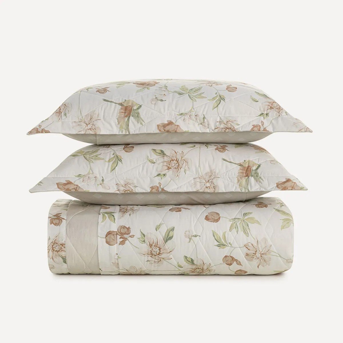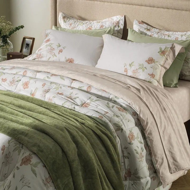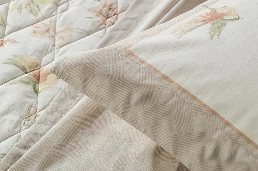 O jogo de colcha Eloise combina leveza e riqueza de detalhes em uma composição encantadora. Com estampa de pássaros e flores em tons de salmão e verde, transmite frescor e delicadeza. A colcha é dupla face: de um lado, a estampa floral suave; do outro, o mesmo padrão geométrico espaçado do jogo de cama, criando equilíbrio visual e sofisticação. Os dois porta-travesseiros matelassados seguem o mesmo conceito, completando a composição com harmonia.