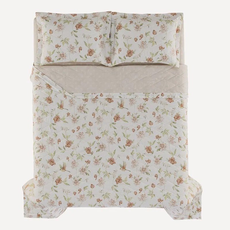 Descrição Visual; Sobre uma base off-white, flores em tons de pêssego, coral suave e verde sálvia decoram a frente da colcha e porta-travesseiros e no verso, uma padronagem geométrica de rosa escuro sobre base rosa clara.