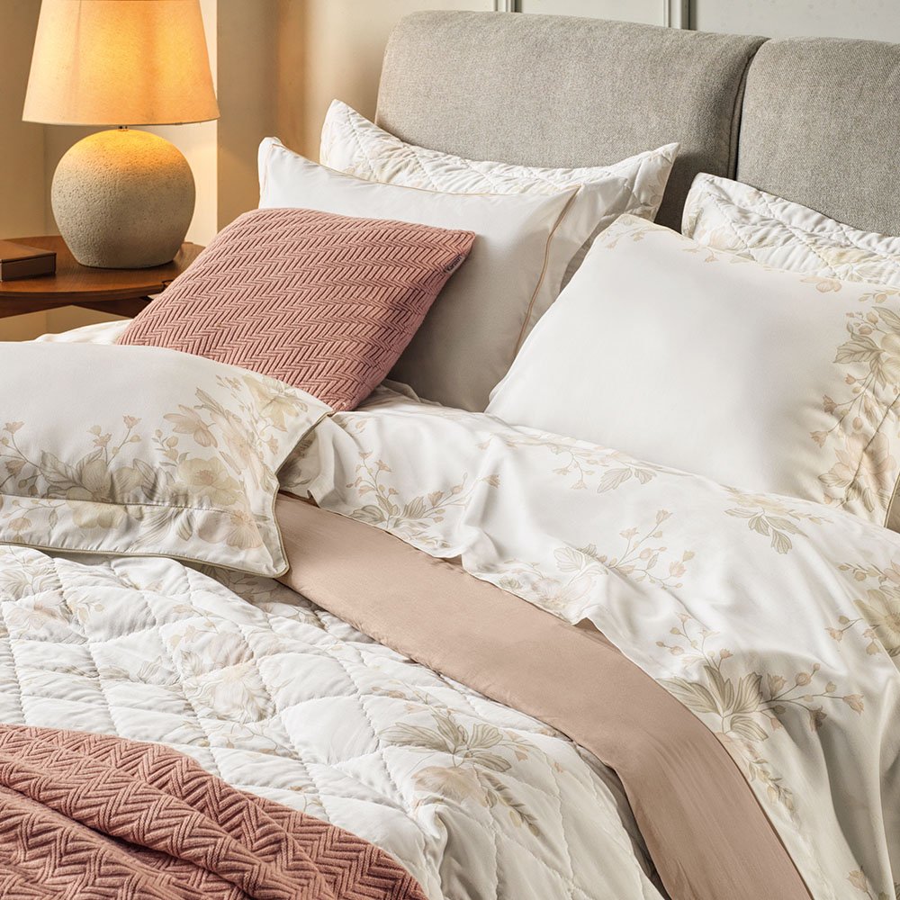 O algodão egípcio tem propriedades hipoalergênicas e altamente respiráveis, que são gentis com a pele, regulam a temperatura corporal e proporcionam uma noite de sono perfeita. Suas fibras longas impedem a formação de bolinhas e garantem fios mais finos, criando um tecido muito mais suave e confortável.