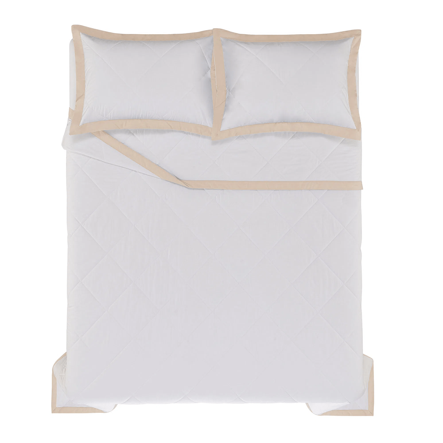 Acabamento: Percal 200 Fios; 100% Algodão; Dobra feita com pala tinta, colcha com bordo tinto e porta-travesseiros com 4 abas tintas.