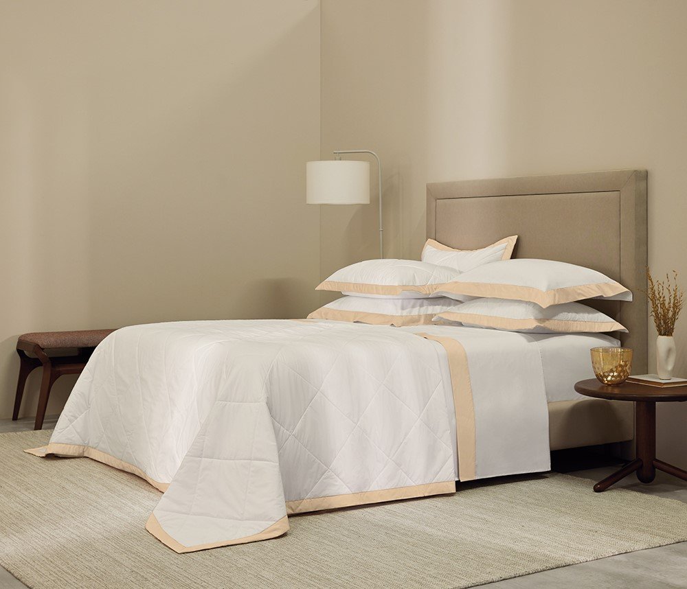 O jogo de Colcha possui detalhes sinuosos, com dobra feita com pala tinta, porta-travesseiros com 4 abas tintas e colcha com bordo tinto. Um conjunto que tornará o quarto em um ambiente sereno e deslumbrante.