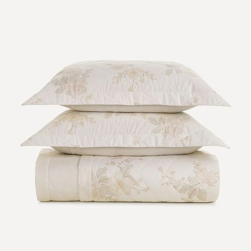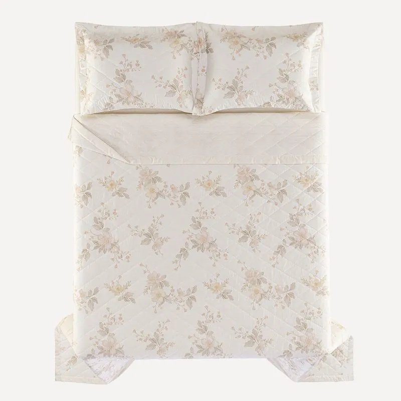 Com flores imponentes e elegância suave, o jogo de colcha Mariah transforma a cama em um convite ao aconchego. Sua estampa floral dimensionada percorre toda a colcha, criando movimento e fluidez, enquanto os tons delicados trazem leveza ao ambiente. A peça é dupla face e conta com acabamento termobond, que mantém o enchimento no lugar mesmo após várias lavagens. Os dois porta-travesseiros coordenados, com acabamento matelassado, completam a composição com harmonia.