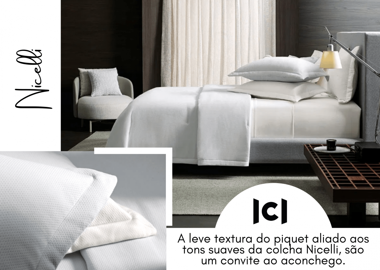 A colcha Nicelli, transfere requinte e elegância já no primeiro olhar. Com sua leve textura do Piquet e seus tons suaves, é um convite perfeito para fazer a composição de um ambiente harmônico e cheio de vida. É confeccionada em 100% Algodão e seu verso possui 300 fios percal. Se encante com a qualidade de Trussardi!