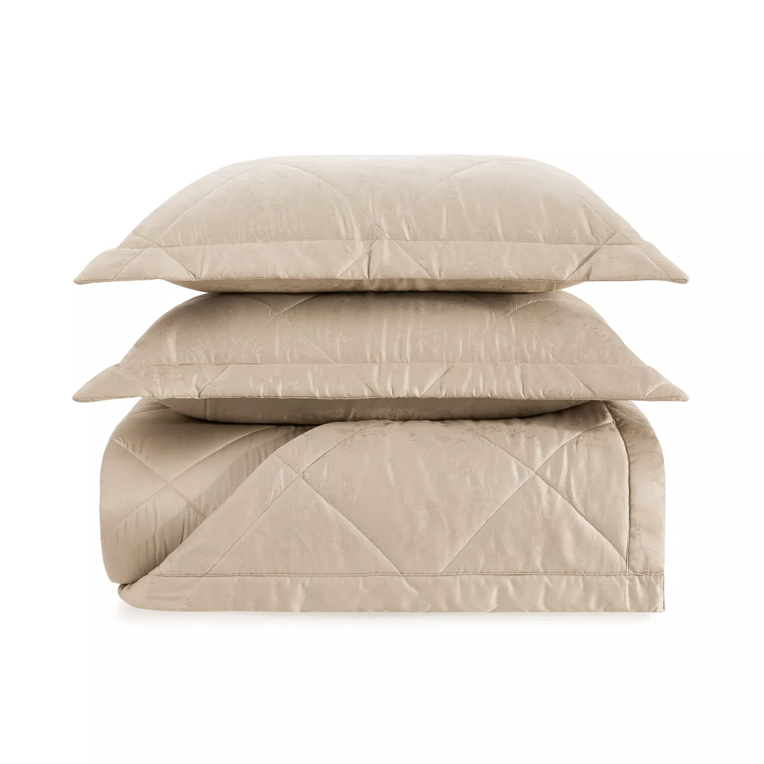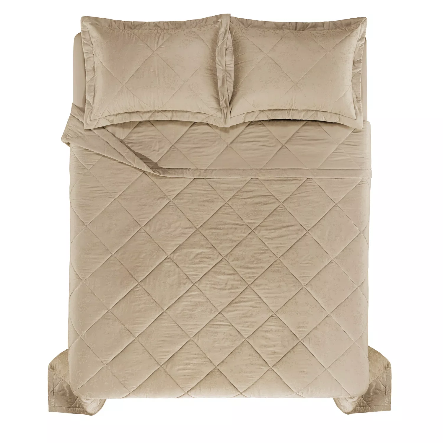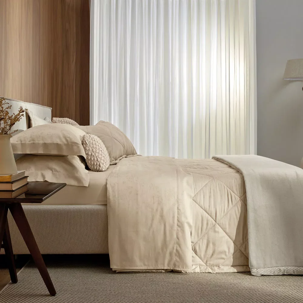 Acabamento: Tecido sanforizado e mercerizado; Manta 100g; Porta Travesseiro em jacquard com 4 abas; Colcha em jacquard com verso em cetim 300 fios