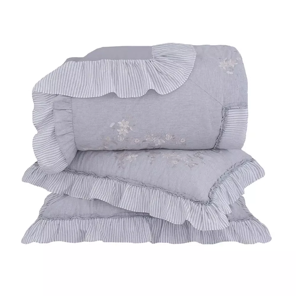 Delicada, confortável e leve, a Colcha Vernazza possui inspiração na tendência farmcore, ressaltando o charme bucólico do campo. Bordados florais, listras em fio tinto e babados, remetem a antigos acabamentos artesanais que envolvem em sensações acolhedoras de um lifestyle natural. Extremamente macia, a Colcha possui a suavidade ultra confortável do puro algodão, promovendo toque aconchegante muito agradável de sentir. A Buddemeyer é referência em qualidade e estilo.