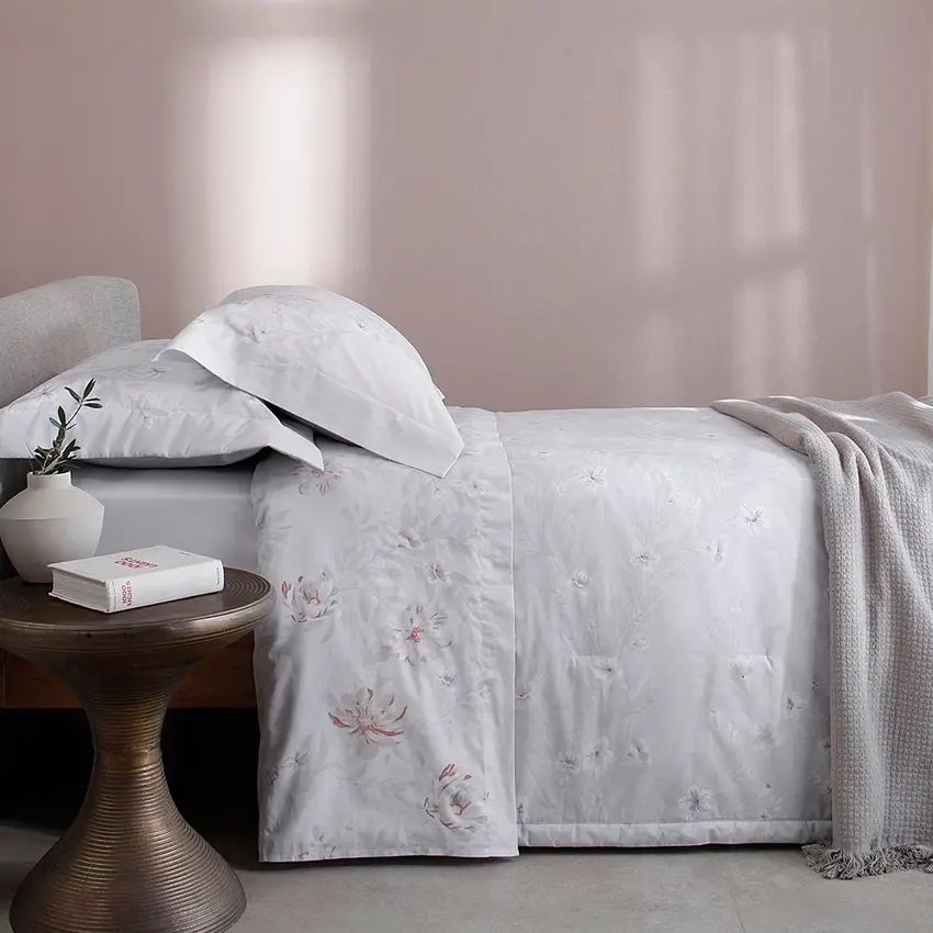 Kit colcha solteiro Enchanté. Elegantes florais com efeito de pintura aquarelada, trazem beleza e sofisticação para a Coleção Enchanté. Os arranjos destacam-se em sobreposições iluminadas que combinam tons neutros com efeito translúcido, agregando leveza e toque artístico para a cama. Em Grand Percalle 200 fios de puro algodão com fibras longas, o modelo possui trama diferenciada construída a partir de finos fios sedosos. Com delicadeza e maciez extraordinária promovendo o conforto em seu ápice. A Buddemeyer é referência em qualidade e estilo.